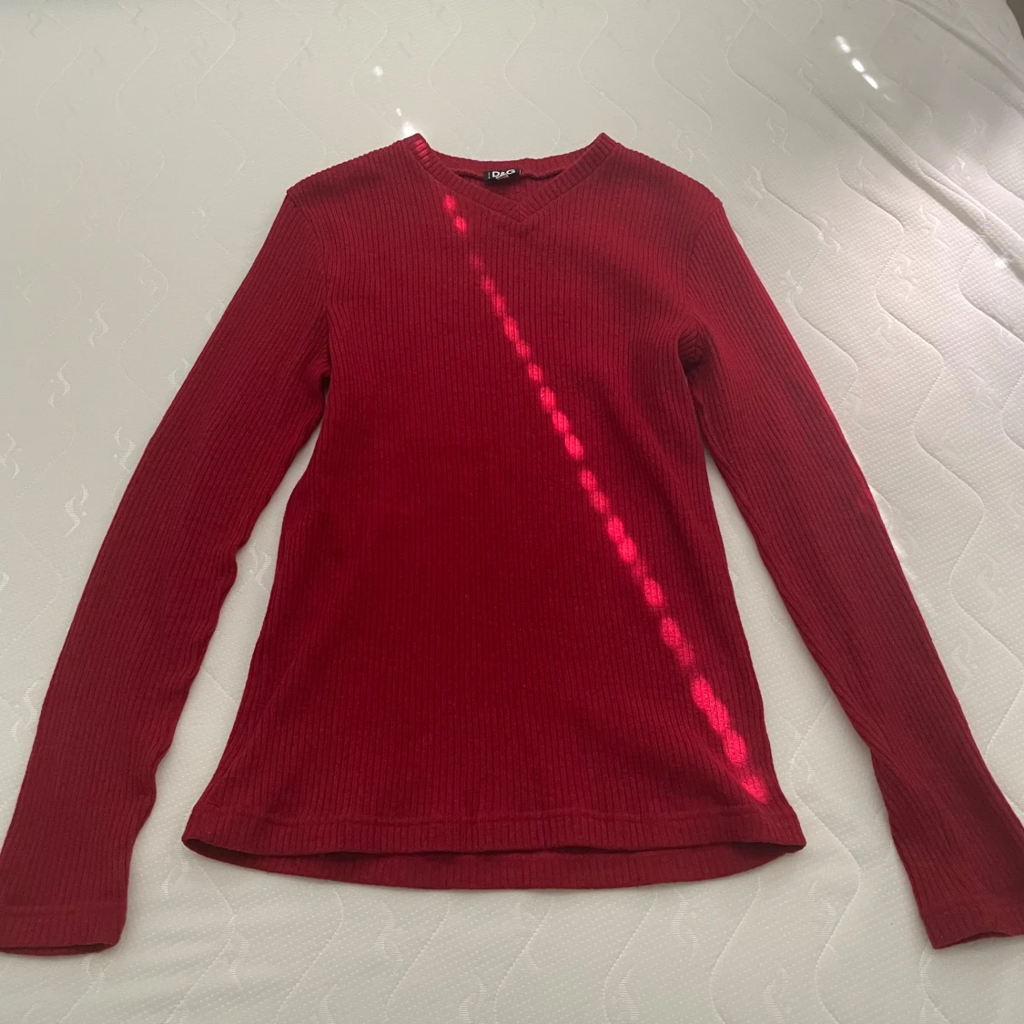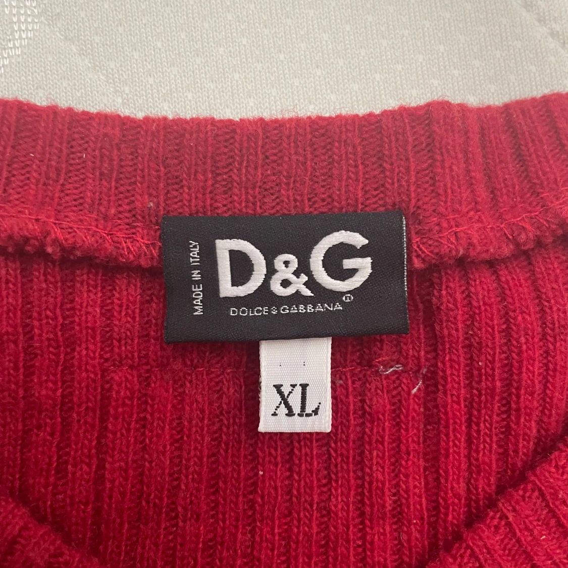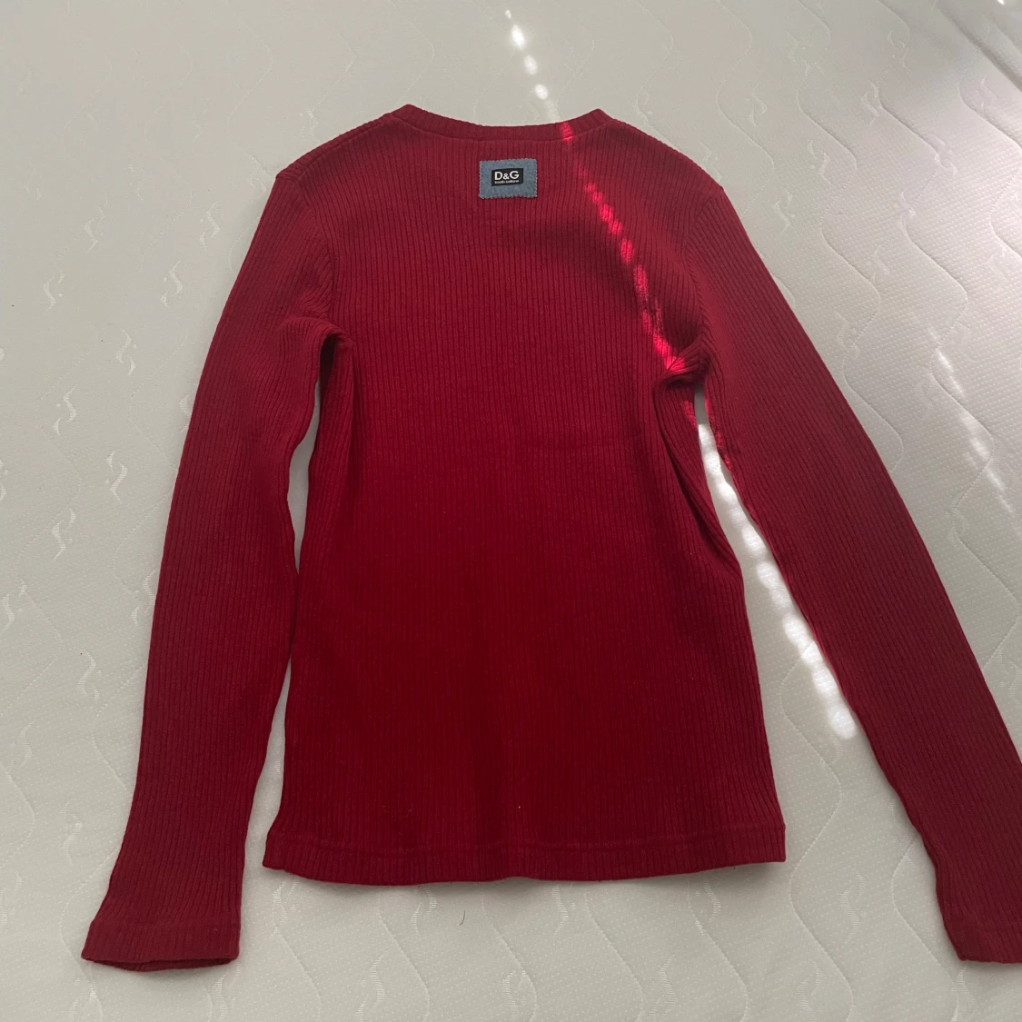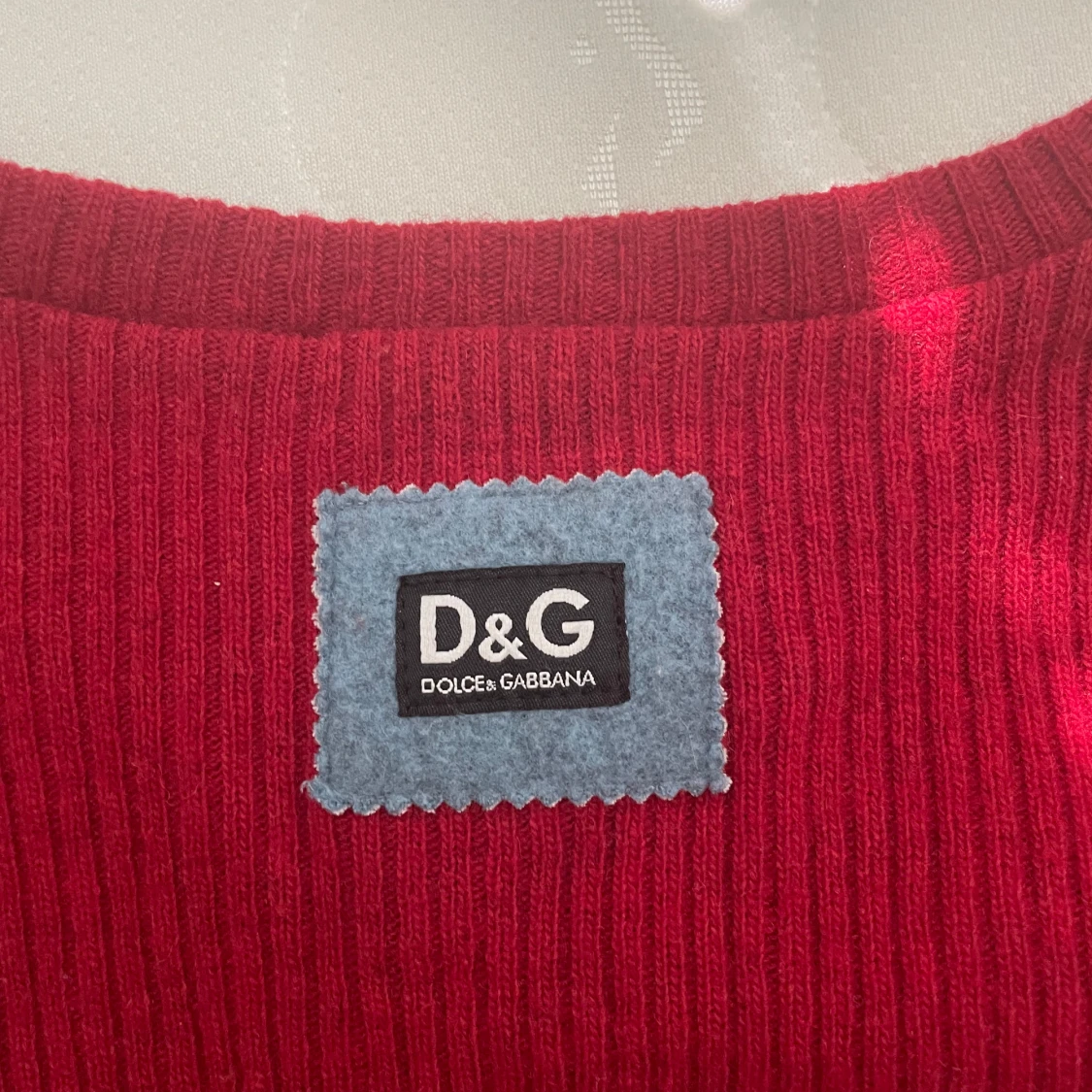 Snygg röd långärmad tröja från Dolce & Gabbana i ribbad bomull. Tröjan har en klassisk rund hals och ett stilrent D&G-märke på ryggen. Perfekt för dig som vill ha en enkel men lyxig look med lite edge. Står XL men passar även L