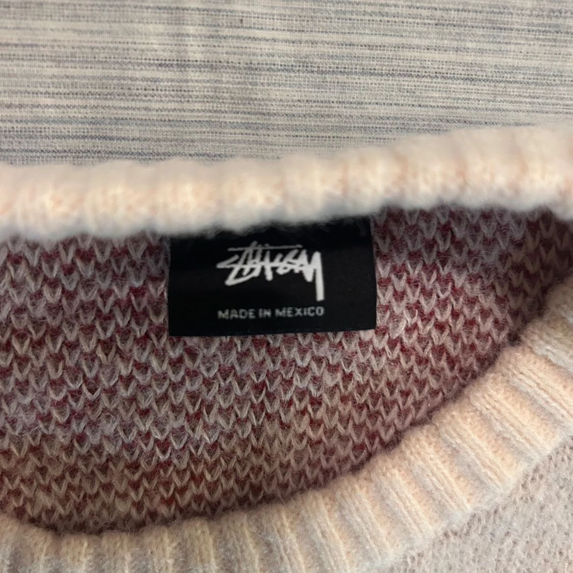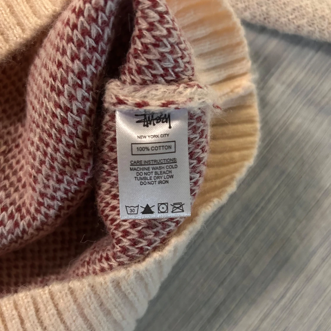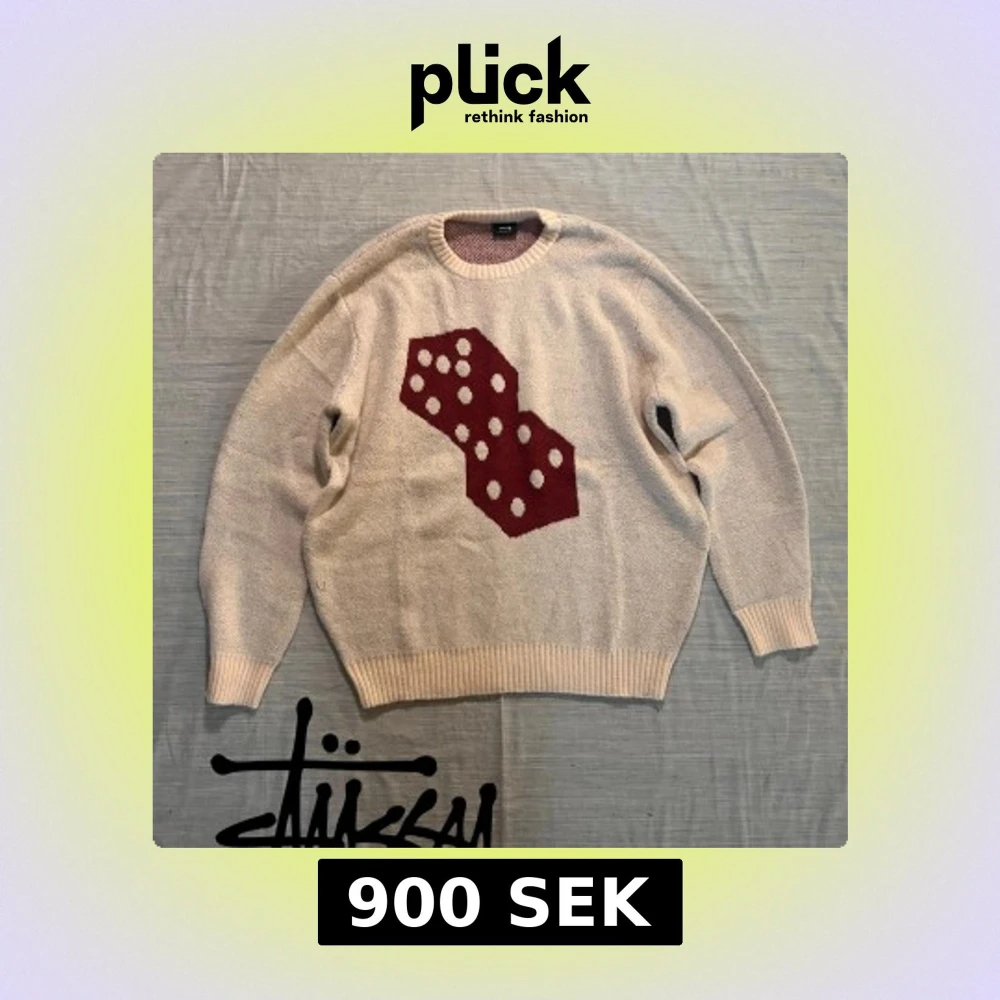 Säljer en beige stickad tröja från Stüssy med stort rött tärningsmönster framtill. Tröjan har rund halsringning, ribbade muddar och är tillverkad i 100% bomull. Perfekt för dig som gillar streetwear och unika prints.
