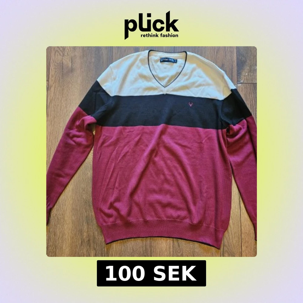 Snygg v-ringad tröja från Allen Solly i storlek XL. Tröjan har breda ränder i beige, svart och vinrött, med en liten broderad logga på bröstet. Långärmad och tillverkad i mjuk bomull, perfekt för dig som gillar stilrena färgkombinationer.