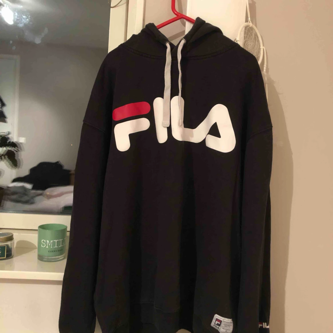 Mysig Fila hoodie i svart. Ganska välanvänd men ändå i okej skick. Den är i storleken XL men skulle kunna användas som en oversized hoodie för någon som har M!!Kan mötas upp i Göteborg men även frakta (köparen står för frakt - ca 50kr) 💓🌟⭐️