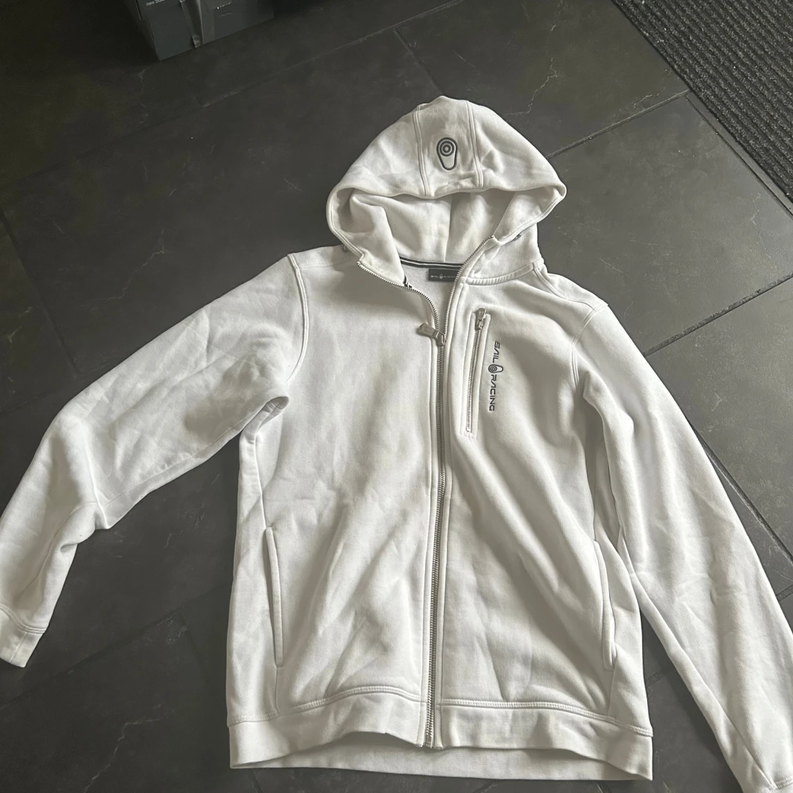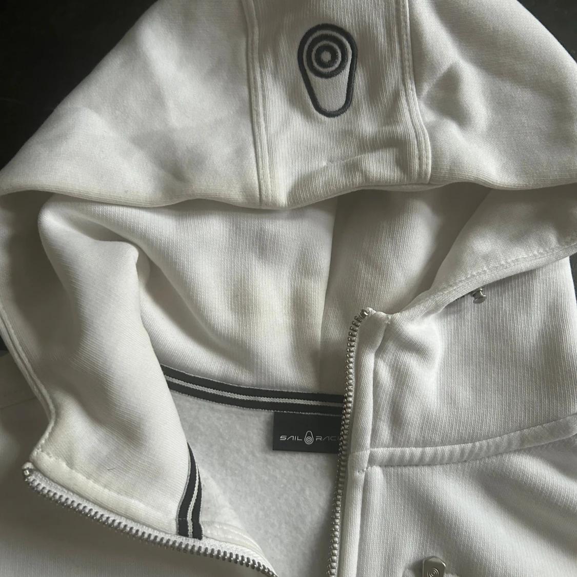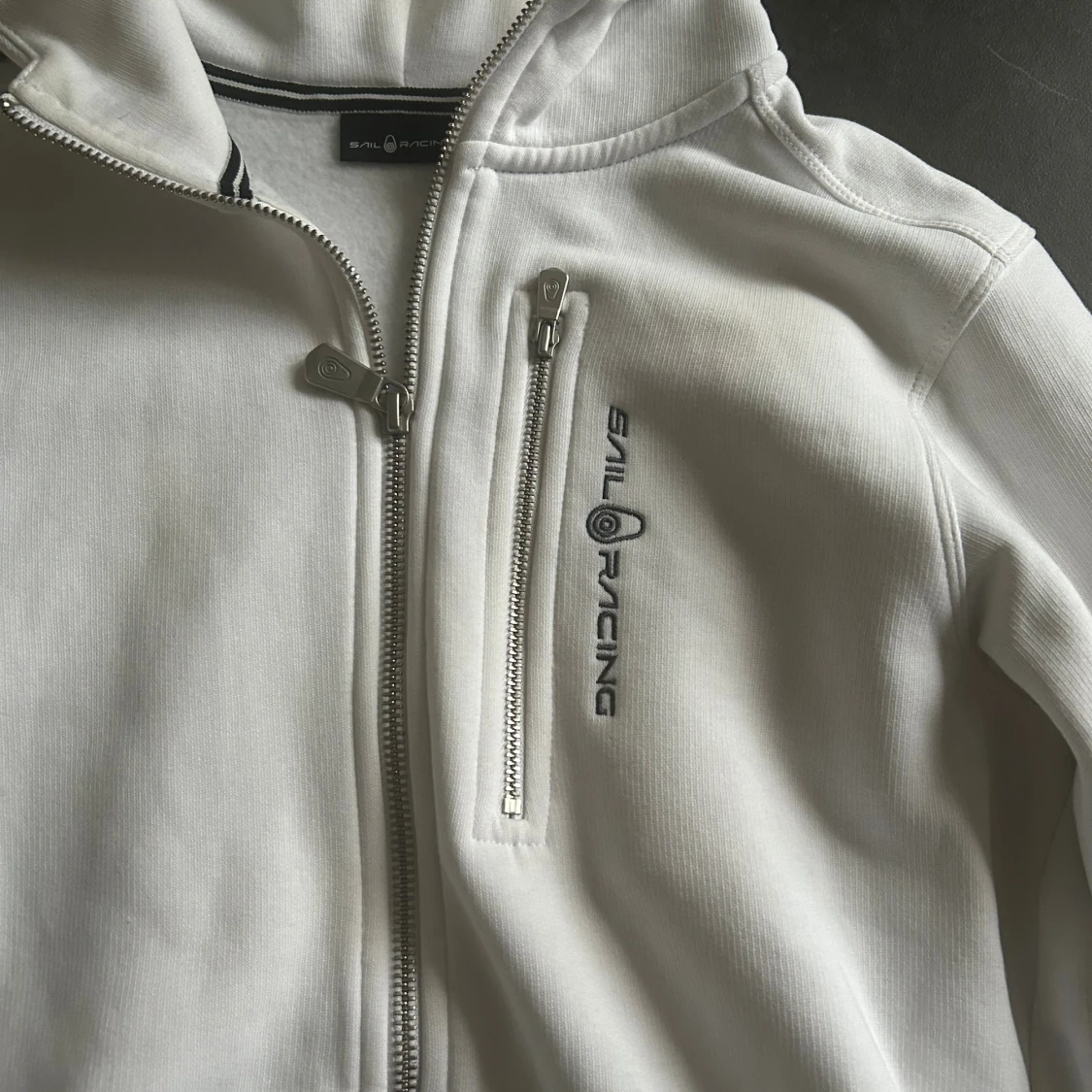 Säljer en snygg vit hoodie från Sail Racing med dragkedja framtill och på bröstfickan. Tröjan har huva med snörning och logga broderad på både bröstet och huvan. Perfekt för chill dagar eller när du vill ha en clean look.