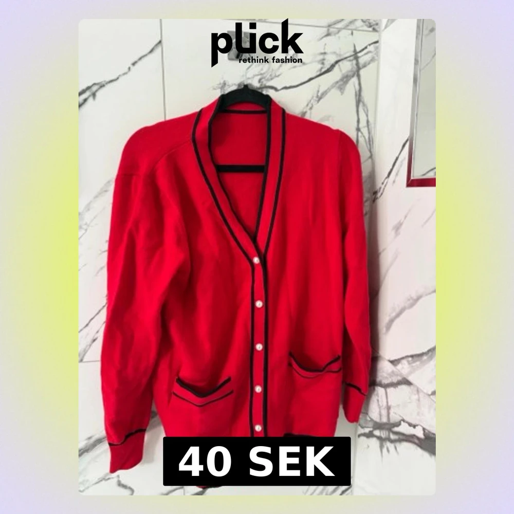 Stilren röd kofta med svarta kanter och vita knappar framtill. Två fickor med svarta detaljer och ribbade muddar vid ärmslut och nederkant. Inga skador eller defekter.