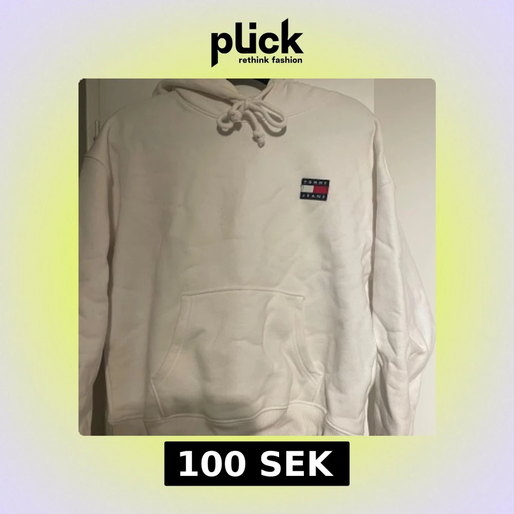 Säljer en stilren vit hoodie från Tommy Jeans. Den har en klassisk design med en liten logotyp på bröstet och en praktisk känguruficka framtill. Perfekt för en avslappnad look.