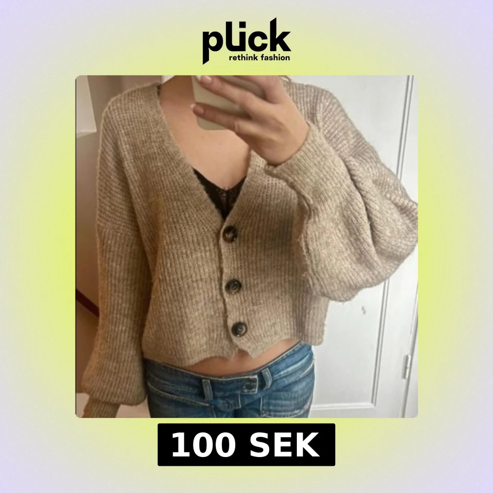 Säljer en beige stickad kofta med tre stora knappar framtill. Koftan är croppad och har långärmade, lite puffiga ärmar
