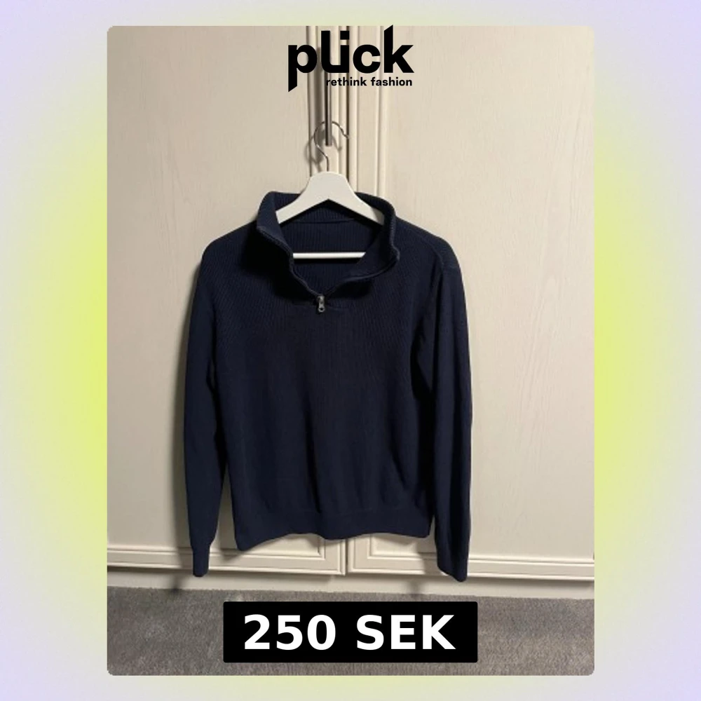 Snygg marinblå stickad tröja med half zip och hög krage. Perfekt för dig som gillar stilren och avslappnad stil. Skick 10/10 säljs för 250kr pris kan diskuteras!