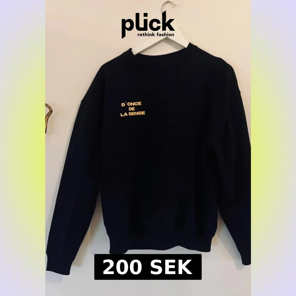 Svart sweatshirt med gul text från D'ONCE DE LA SENSE i storlek XS. Tröjan har rund hals, ribbade muddar och lång ärm. Perfekt för dig som gillar stilrena och enkla plagg med en touch av statement. Materialet känns mjukt och bekvämt mot huden.