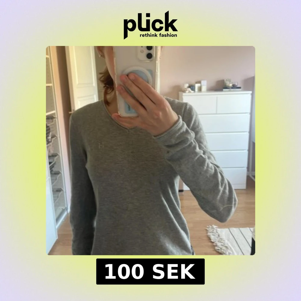 Säljer en stilren grå långärmad tröja från Harcour med v-ringning. Tröjan har broderad logga på bröstet och stor brodyr på ryggen💞