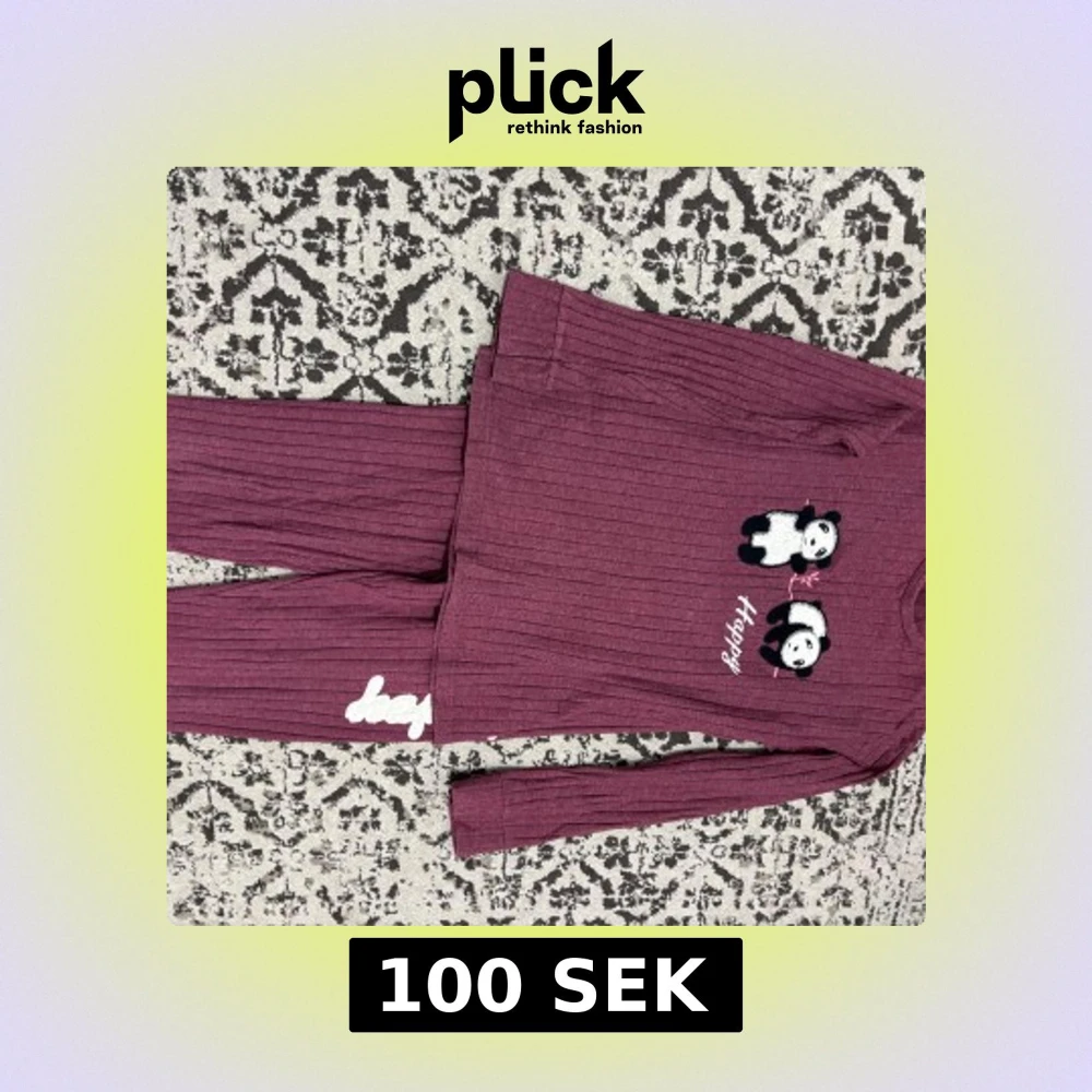 Säljer en mörklila ribbad långärmad tröja med söta broderade pandor och texten 'happy' framtill. Tröjan har en avslappnad passform och är gjord i mjukt material som passar perfekt för mysiga dagar. Den har rund hals och ett gulligt, ungdomligt uttryck.