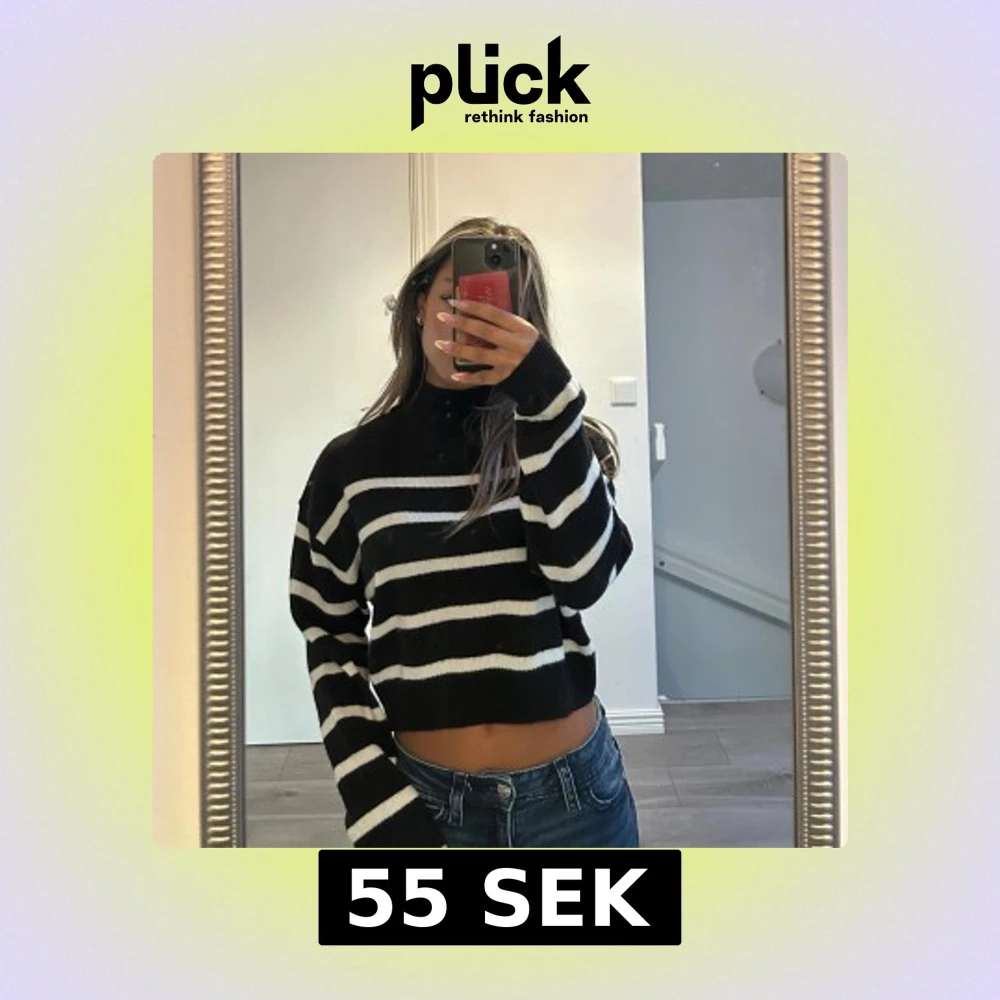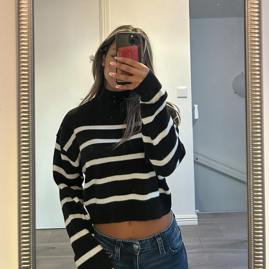 Säljer en svart och vit randig croppad stickad tröja med polokrage. Tröjan har långa ärmar och en loose passform, perfekt för dig som gillar en avslappnad stil. Snygg att matcha med jeans eller kjol.