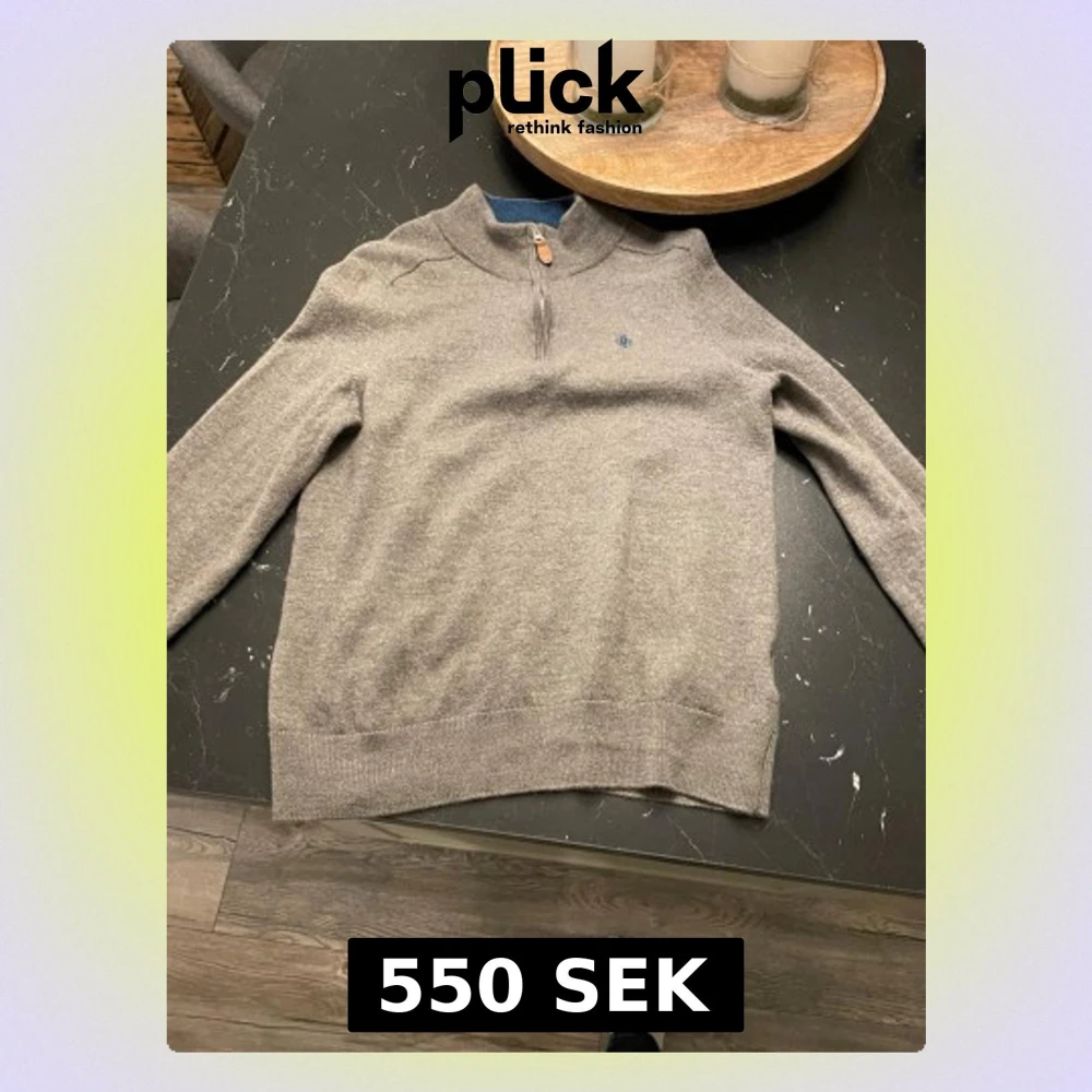 Säljer en grå stickad tröja med half zip och hög krage. Tröjan har långa ärmar och en liten blå broderad logga på bröstet. Perfekt för lager på lager och enkel att matcha till olika outfits. Storlek S men lite krymp i tvätten så passar xs använd 1 gång