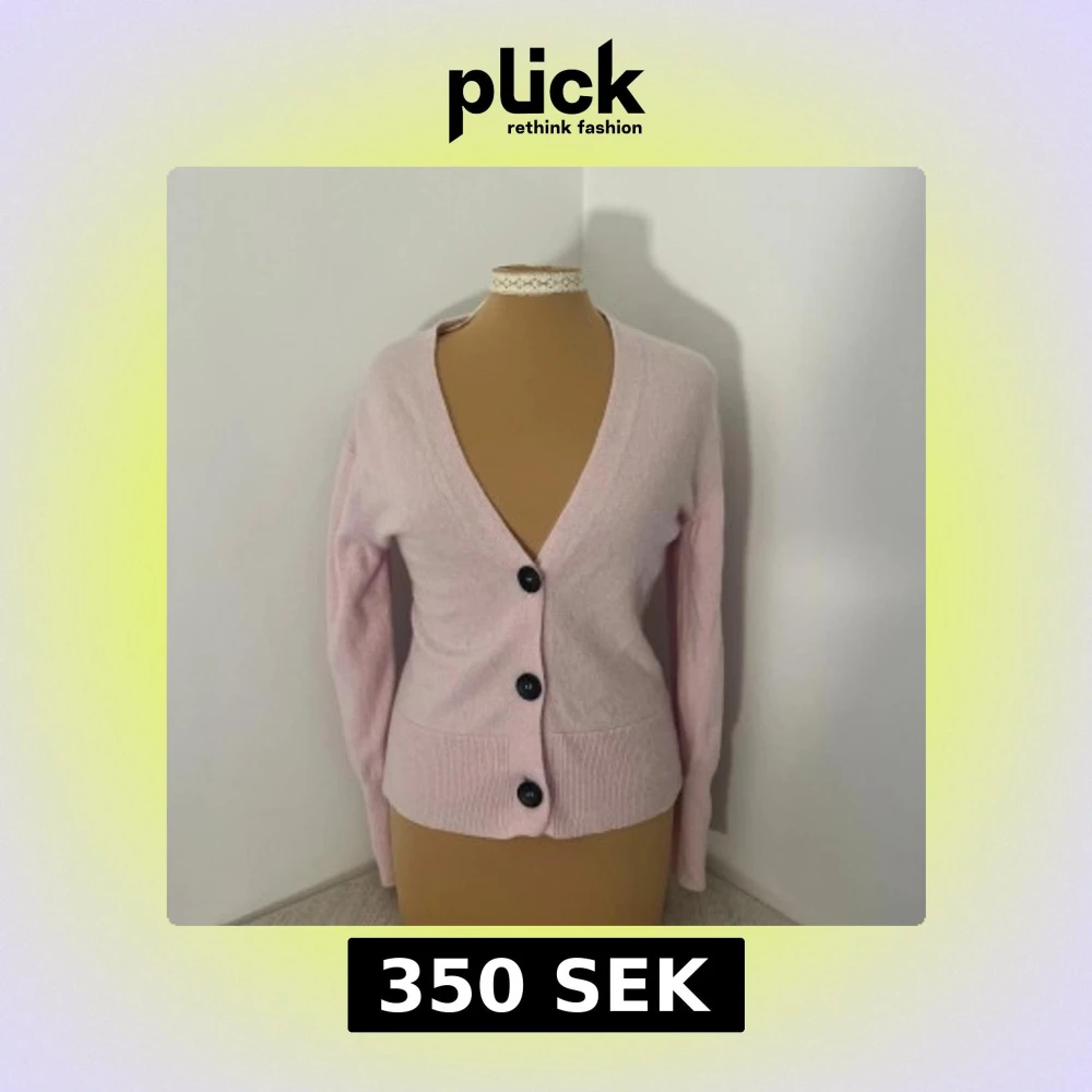 Söt ljusrosa kofta från Levete Room i storlek XS. Koftan har djup v-ringning, tre svarta knappar framtill och ribbad kant vid midjan och ärmslut. Mjuk och skön, perfekt för lager-på-lager. Långärmad och med feminin passform.
