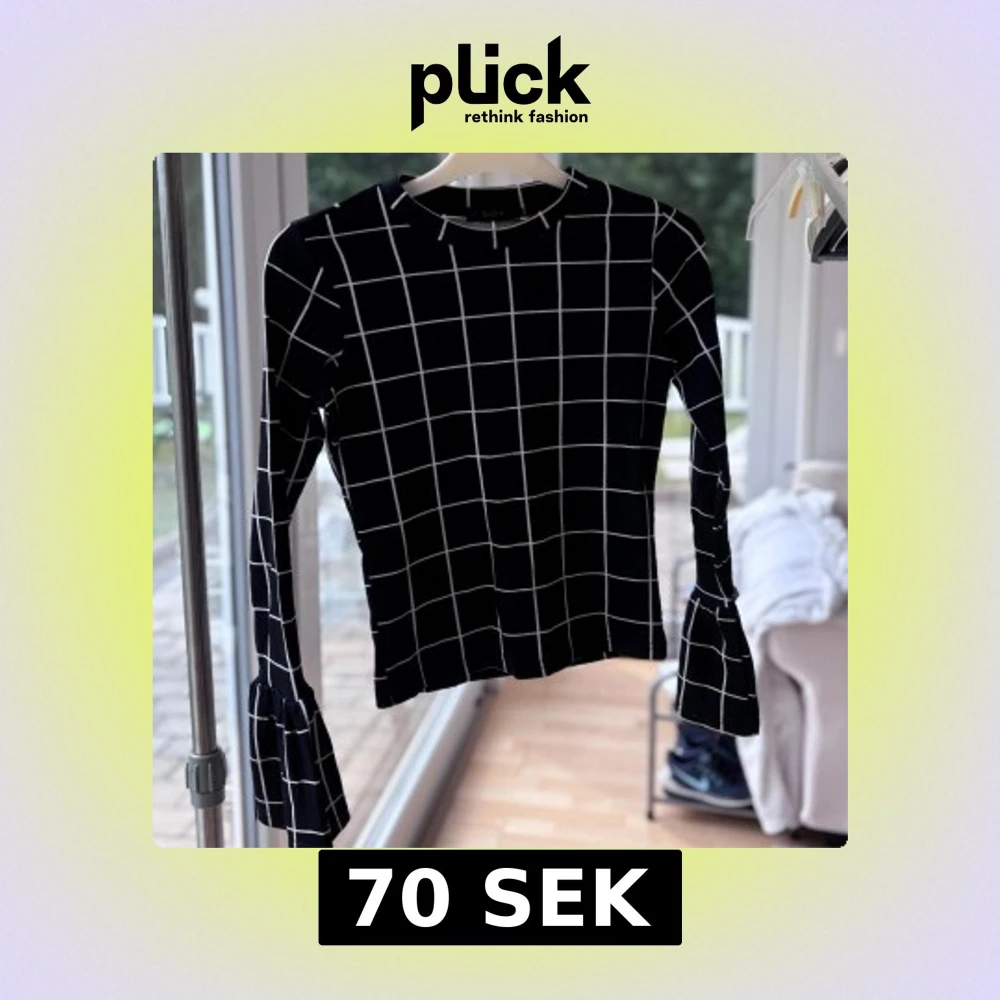 Svart långärmad topp med vitt rutmönster och trendiga trumpetärmar. Sitter snyggt med normal passform och har en rund halsringning.