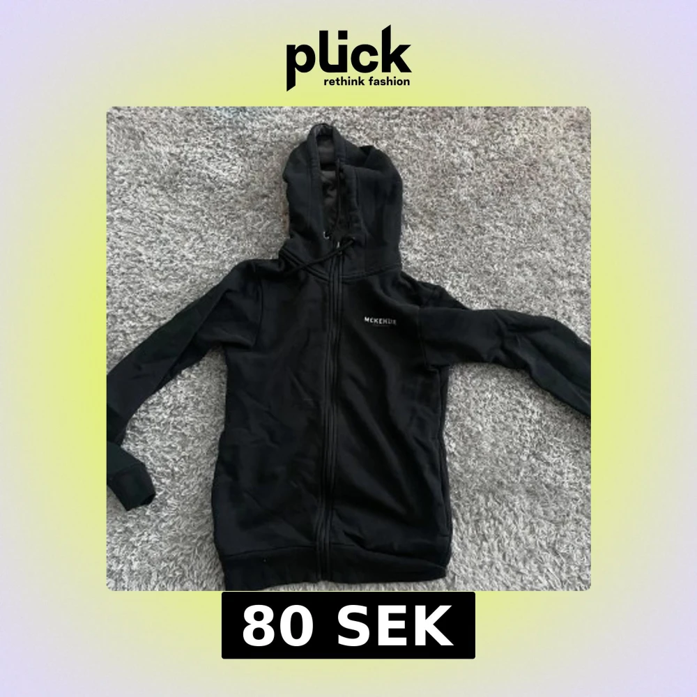 Svart hoodie från McKenzie med hel dragkedja och huva med snörning. Mjuk insida och diskret logga på bröstet. Perfekt för chill dagar eller när du vill ha en enkel och stilren look. Denna är använd några gånger och är i storlek XS