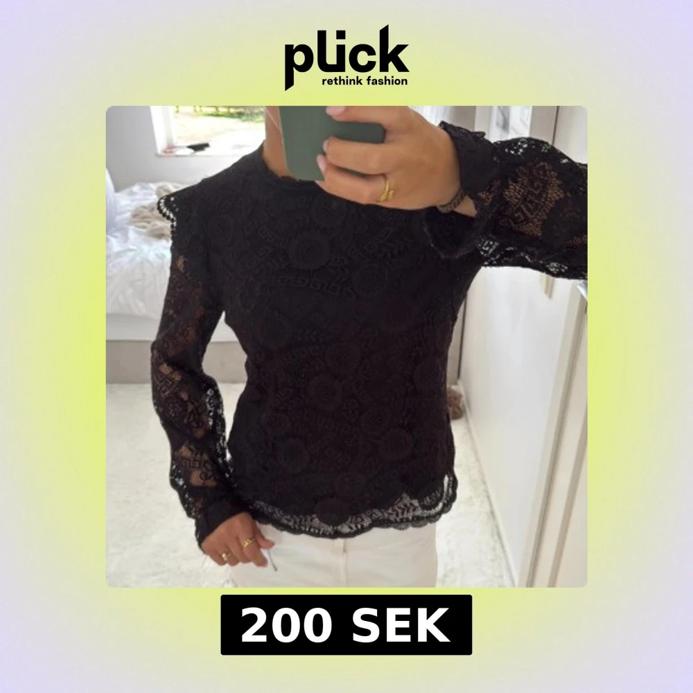 Svart långärmad blus från Pieces i storlek XS, helt i spets med snygga cirkelmönster och detaljerad kant vid hals och nederdel. Blusen har en liten knapp i nacken och transparenta ärmar med lätt puff. Perfekt för dig som gillar stilrena och unika plagg.