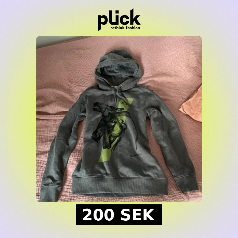 Snygg grå hoodie från ALLIN Equestrian i storlek XS. Tröjan har ett coolt hästmotiv i svart och grönt på framsidan, huva med snörning och långa ärmar. Perfekt för dig som gillar ridning och vill ha en chill look.
