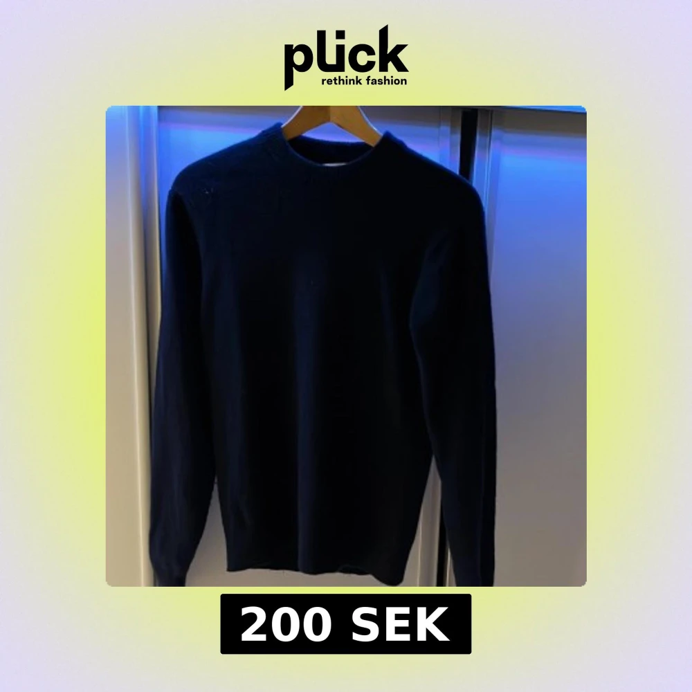 Säljer en stilren mörkblå stickad tröja med rund hals. Perfekt för kyligare dagar och enkel att matcha med olika outfits. Tröjan har långa ärmar och en klassisk passform.
