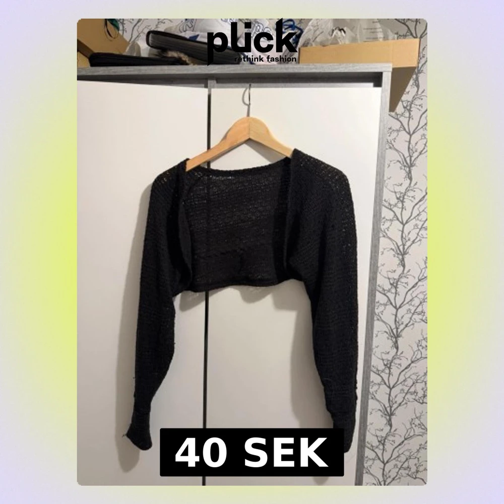 En svart stickad bolero med långärmad design och öppen front. Materialet är tunt och luftigt, perfekt att slänga över en topp eller klänning. Kort modell som slutar ovanför midjan och ger en cool layering-effekt.