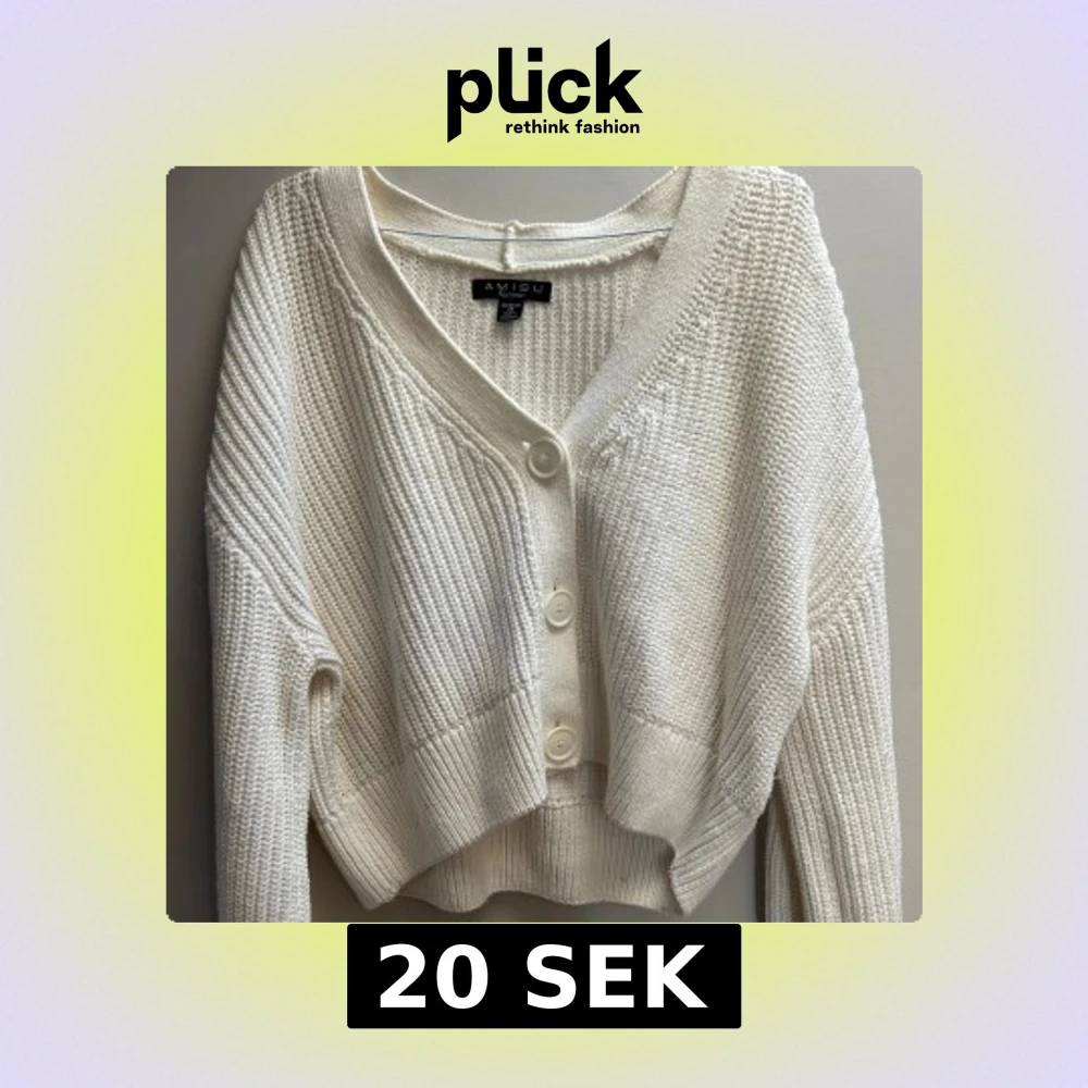 Superfin vit stickad kofta från Amisu med v-ringning och stora knappar framtill. Modellen är croppad och har långa ärmar samt breda ribbade muddar. Perfekt att slänga över en topp för en chill look.