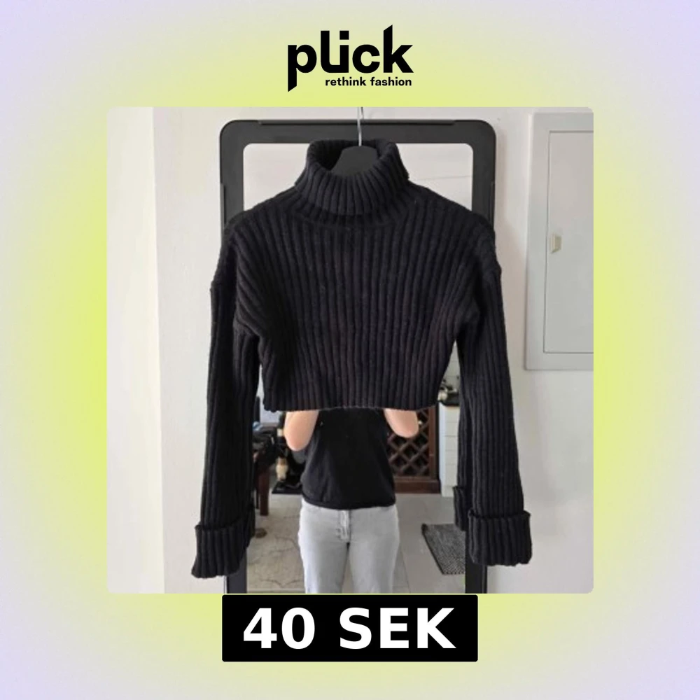 Säljer en svart croppad polotröja med bred ribbstickning och uppvikta ärmslut. Tröjan har hög polokrage och är långärmad, perfekt för att skapa en trendig lager-på-lager-look.