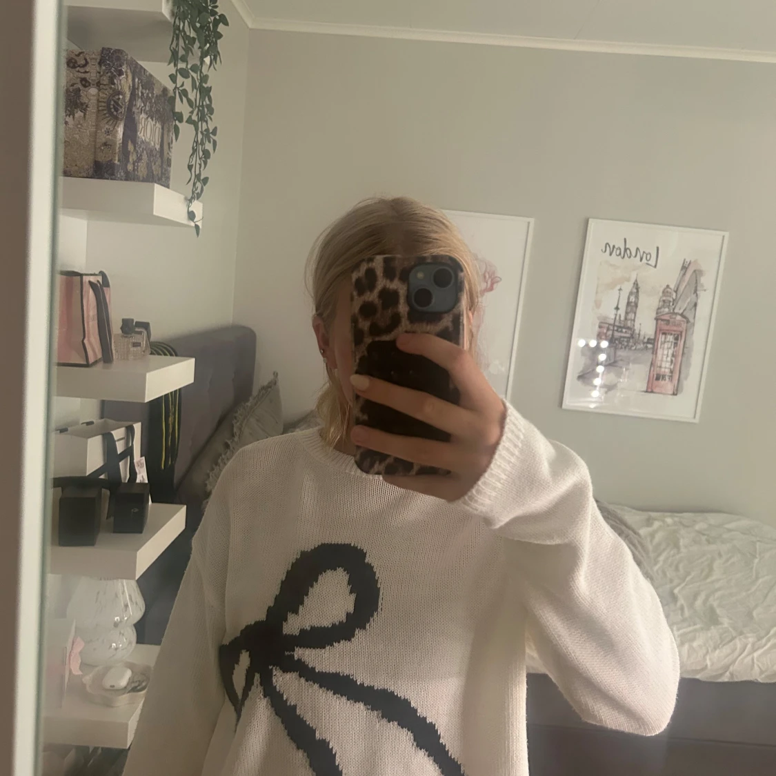 Superfin vit stickad tröja med en stor svart rosett framtill. Finns ingen lapp kvar så vet ej vart den är ifrån.