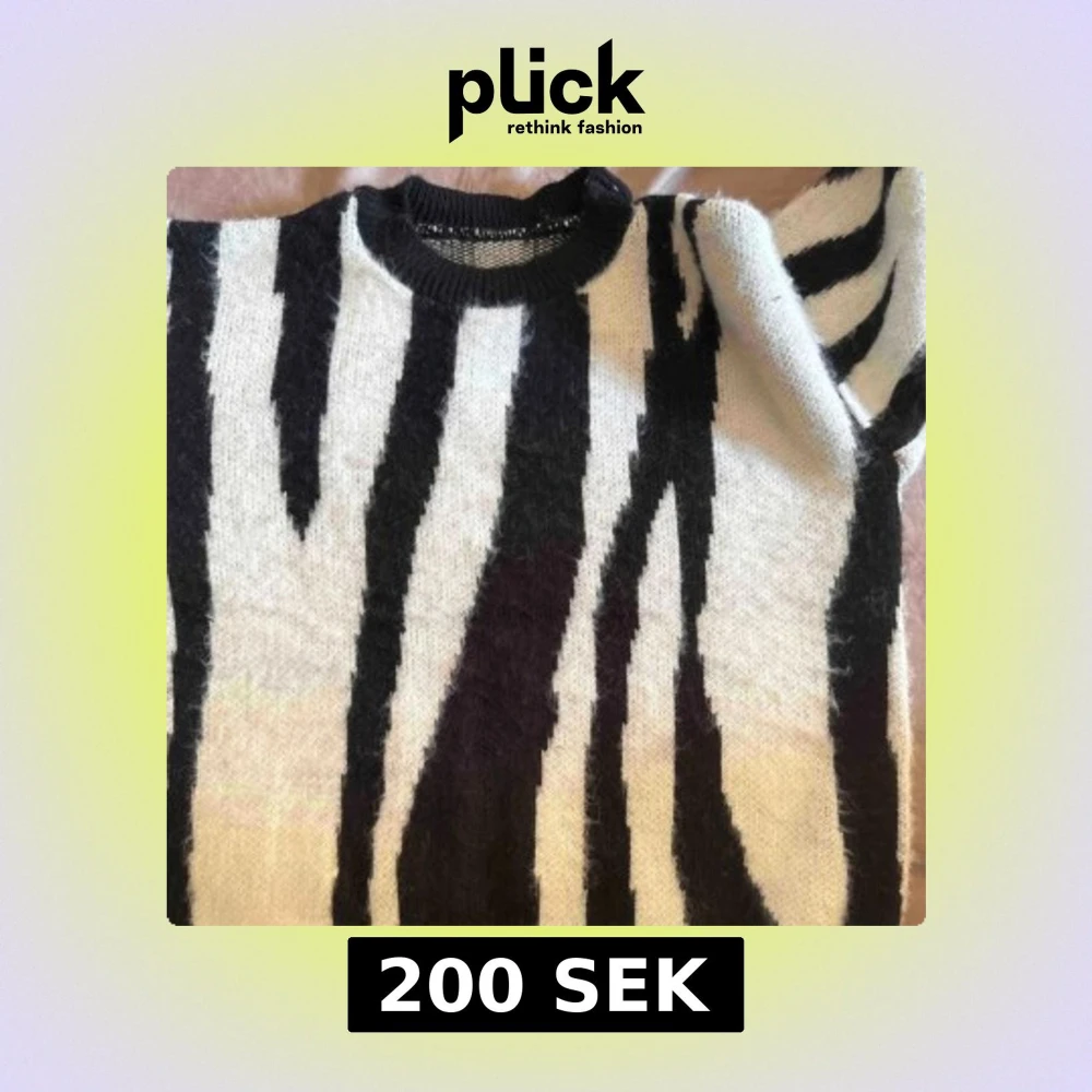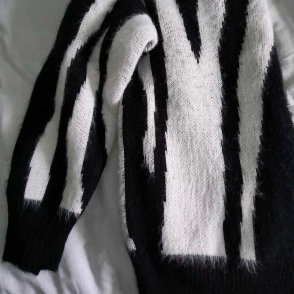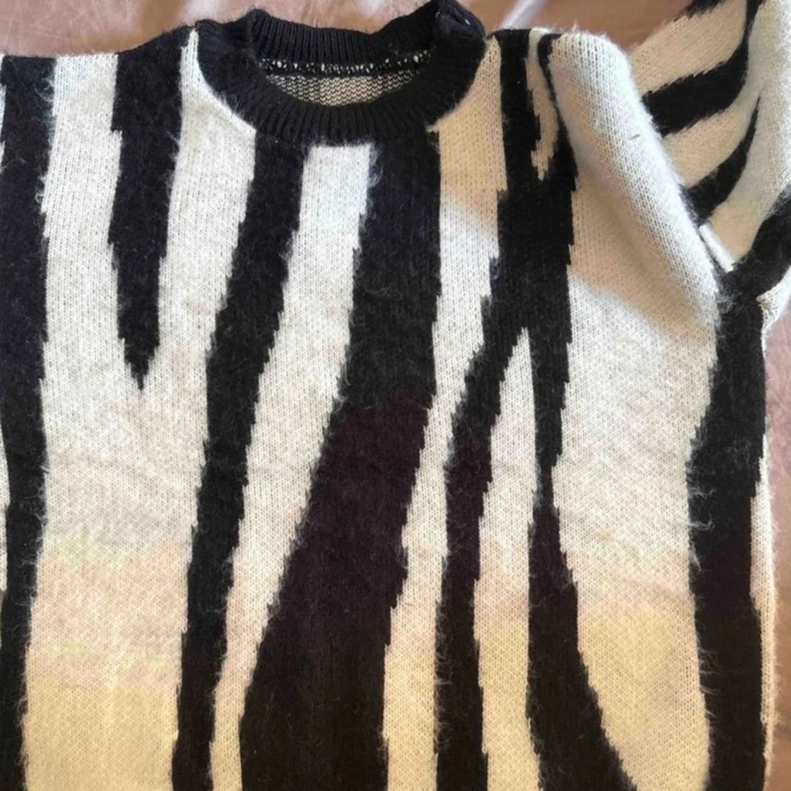 Säljer en stickad tröja med svartvitt zebramönster. Tröjan har rund halsringning och långa ärmar. Den är fluffig och mjuk, perfekt för dig som vill sticka ut med en cool djurinspirerad look.