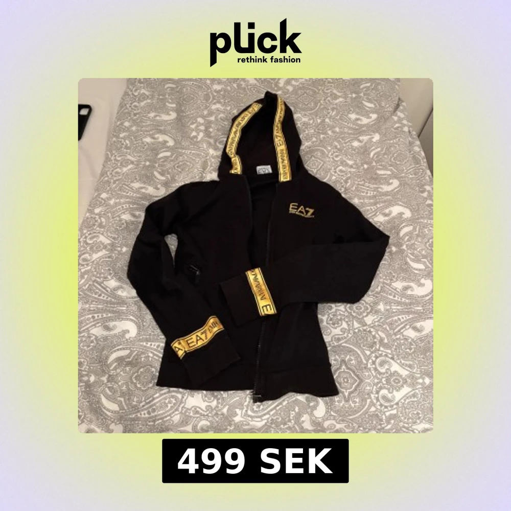 Svart koftafrån EA7 Emporio Armani med guld logga på bröstet och guldiga band med tryck på huva och ärmslut. Dragkedja framtill och ficka med dragkedja. Skön passform. Går ej att köpa från butik. Lite slitage i ärmarna.