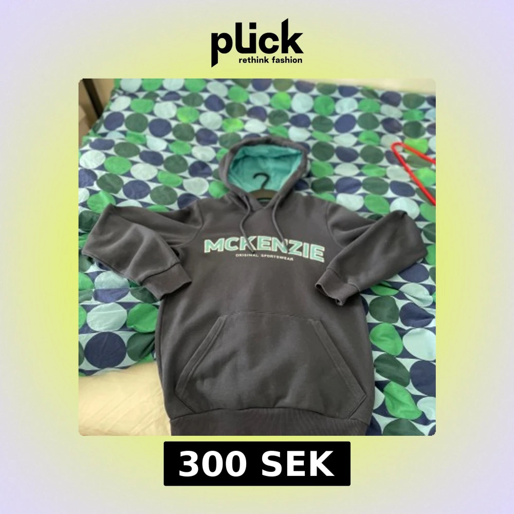 Snygg svart hoodie från McKenzie med stor logga framtill. Tröjan har turkos insida på huvan, snörning och en klassisk känguruficka. Perfekt för dig som gillar streetwear och vill ha en bekväm och stilren look.