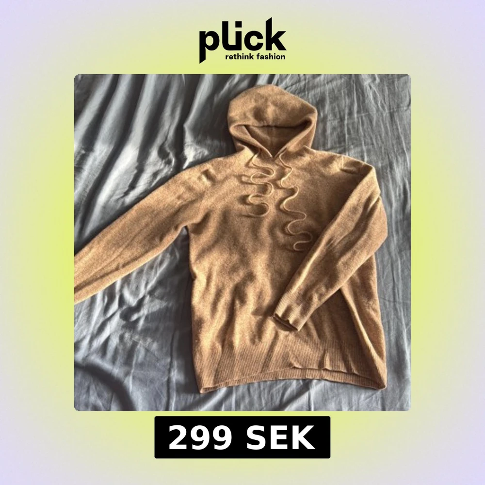 Mysig beige stickad hoodie med långa ärmar och snygga snören. Körde den i tvätten o vips så vart den mindre. När jag köpte den fanns de inga tag’s varifrån den va. Passar xs/s