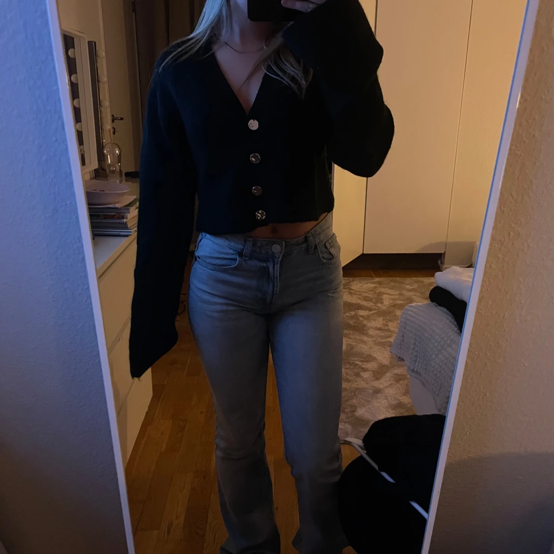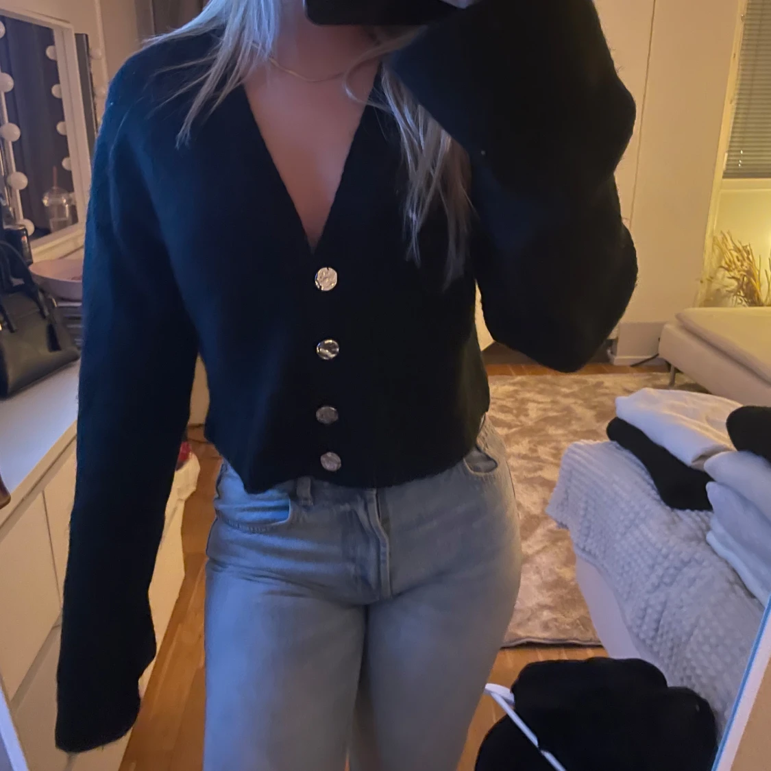 Säljer en svart kofta med knappar framtill. Koftan är croppad och har långa ärmar.