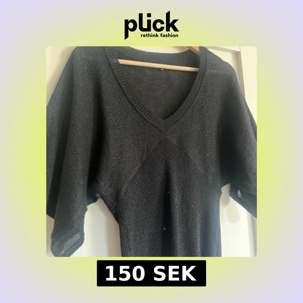 Snygg svart stickad tröja med v-ringning och korta, vida ärmar. Tröjan är lite glittrig och ribbade detaljer vid halsringningen och nedtill. Perfekt för dig som gillar en chill men ändå stilren look.