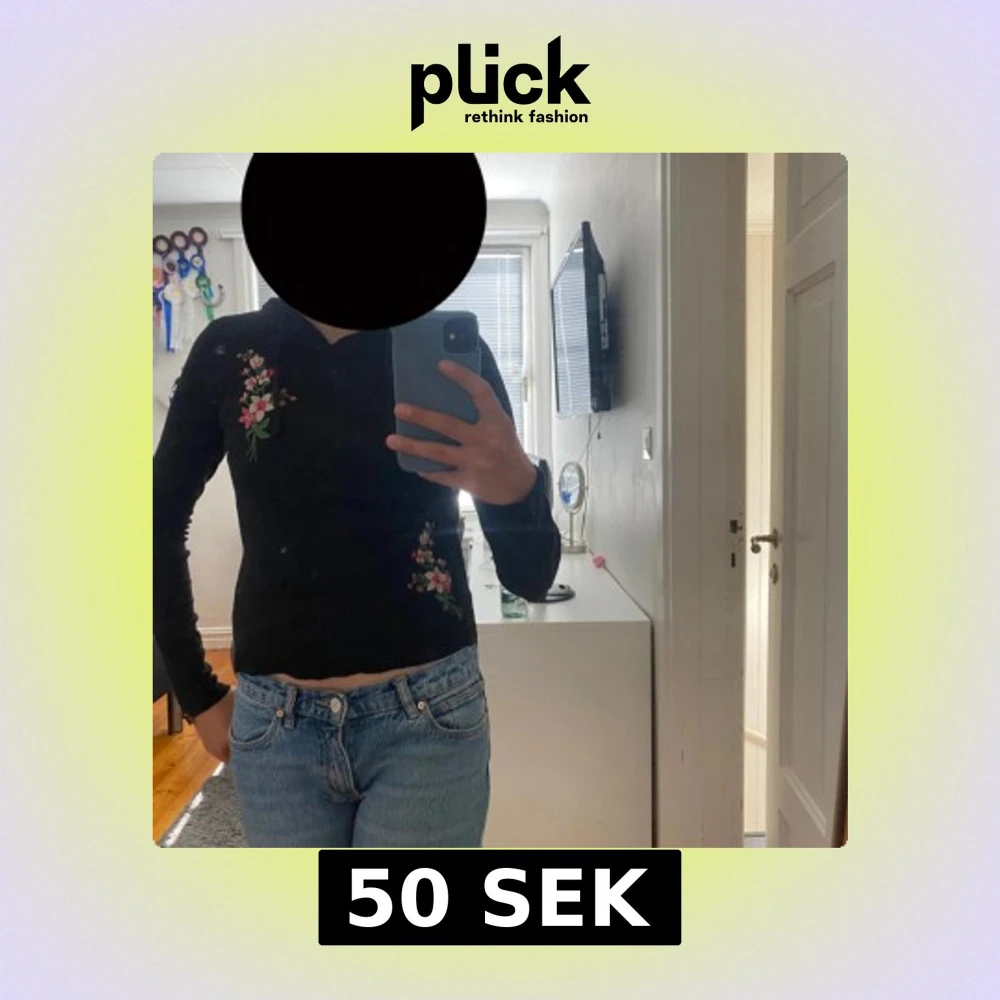 Svart hoodie från FB Sister i storlek XS med broderade blommor i rosa, rött och grönt. Ena ärmen är lite sliten (se bild) annars är den hel. Tunnt material.