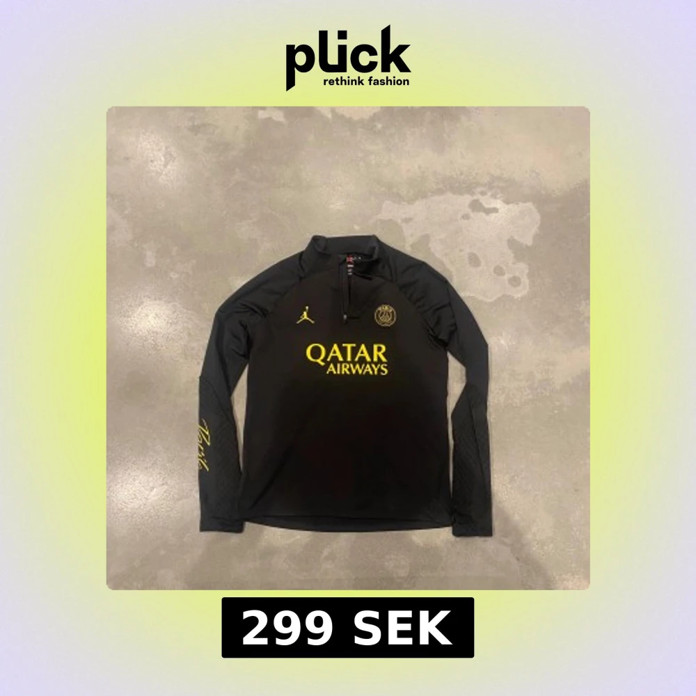 Storlek 158-170cm. Svart PSG x Jordan långärmad tröja med gul logga och detaljer, half zip framtill och Paris-tryck på ärmen. Slim fit-modell i mjukt syntetmaterial, perfekt för fotbollsträning eller chill. Snyggt mönster på ärmarna och klassisk Jordan-logga på bröstet.