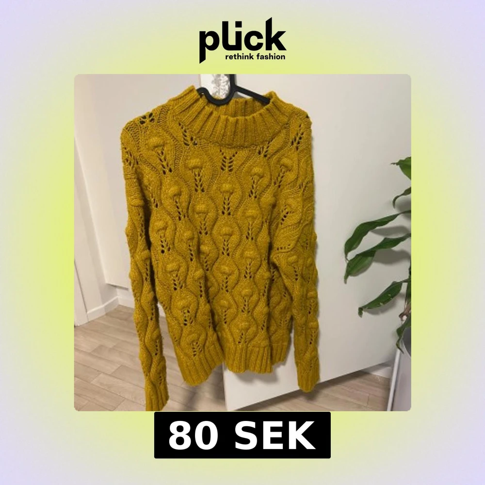 Säljer en snygg gul stickad polotröja med unikt hålmönster och bred ribbad krage. Tröjan har långärmade ärmar och grovstickad struktur som ger en cool och trendig vibe. Perfekt för dig som gillar färg och vill sticka ut.