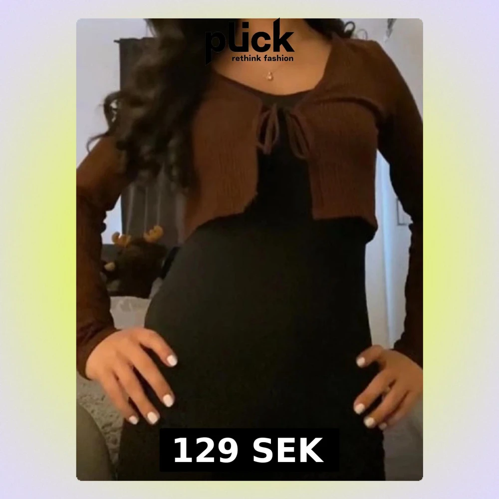 Säljer en brun croppad bolerotopp med långa ärmar och snygg knytning framtill. Toppen har en ribbad struktur och sitter tajt över axlarna. Perfekt för att lägga över en klänning eller linne för en trendig layering-look.