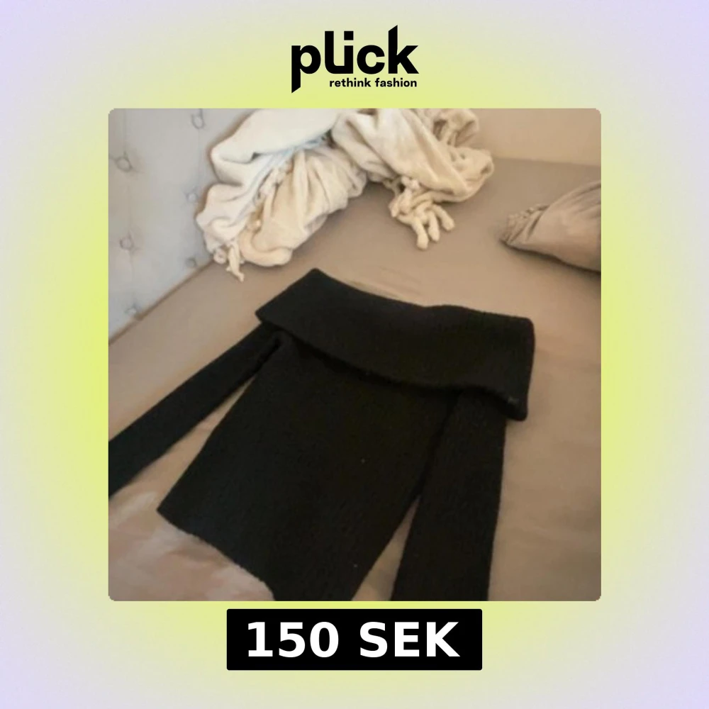 Säljer en svart stickad tröja med bred offshoulderkrage. Tröjan har lång ärm och är perfekt för dig som vill ha en trendig och mysig look. Passar både till jeans och kjol.