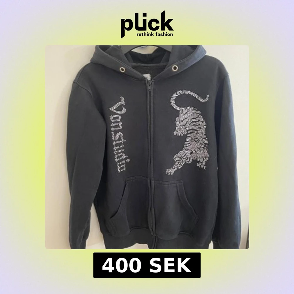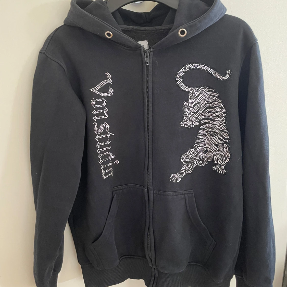 En svart hoodie men vita glittriga prickar som blir en tiger och med namnet på framsidan, inga snören. Modellen är 165cm och väger 49kg och storlek xs. Ny pris: 800 mitt pris 400. OBS! Den är mindre i storleken, hör gärna av er innan ni köper👍🏻