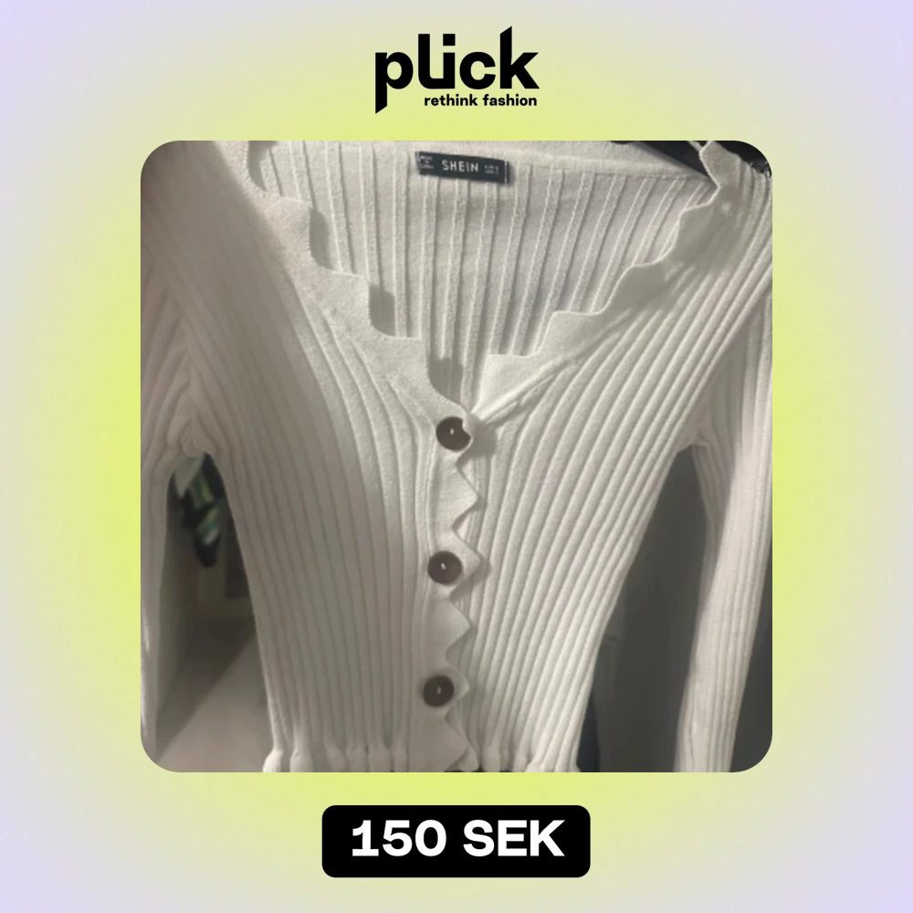 Säljer en superfin vit ribbad kofta från SHEIN. Den har en snygg v-ringad design med knappar framtill och långa ärmar. Perfekt för både vardag och fest! Använd en gång