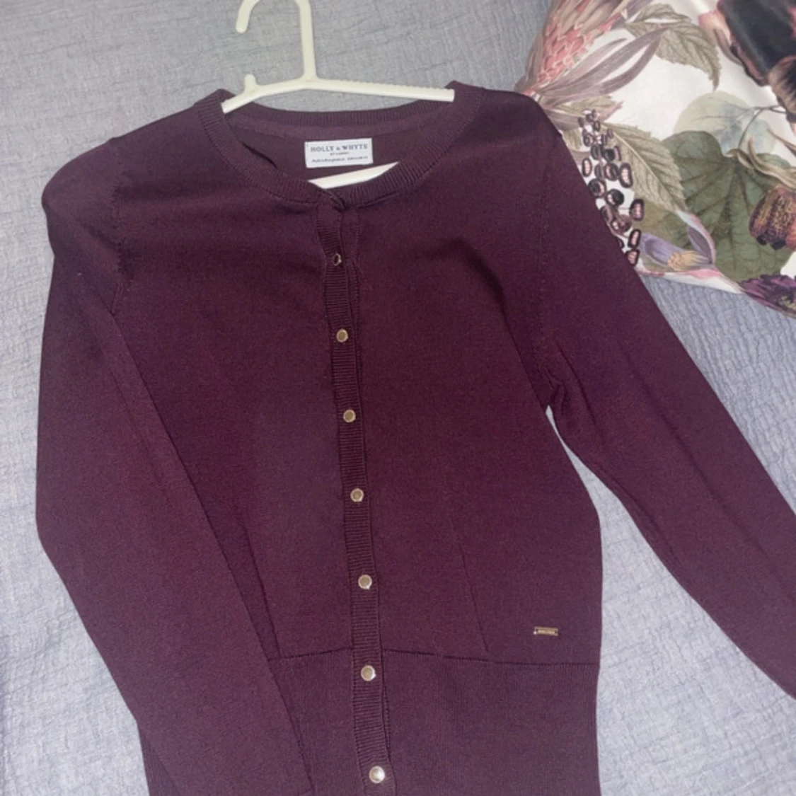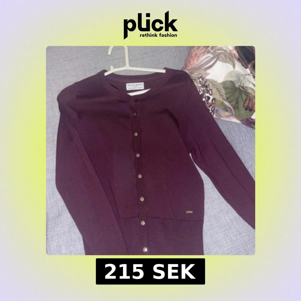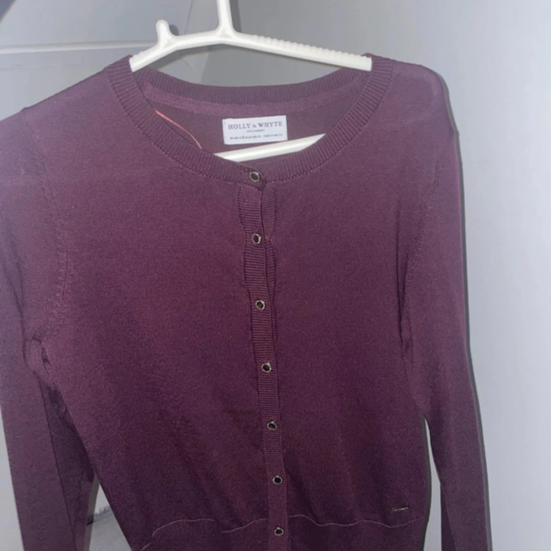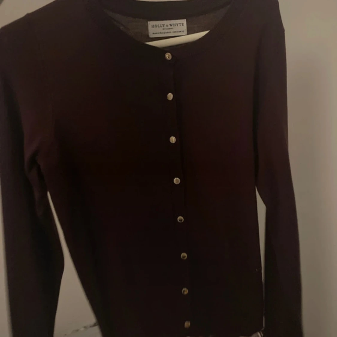 Snygg vinröd kofta från Holly & Whyte med rund halsringning och guldiga knappar framtill. Långärmad och i mjukt, tunt stickat material som passar perfekt till lager-på-lager. Enkel och stilren design som funkar till många outfits. Använd 1 gång så i super skick, storlek xs!