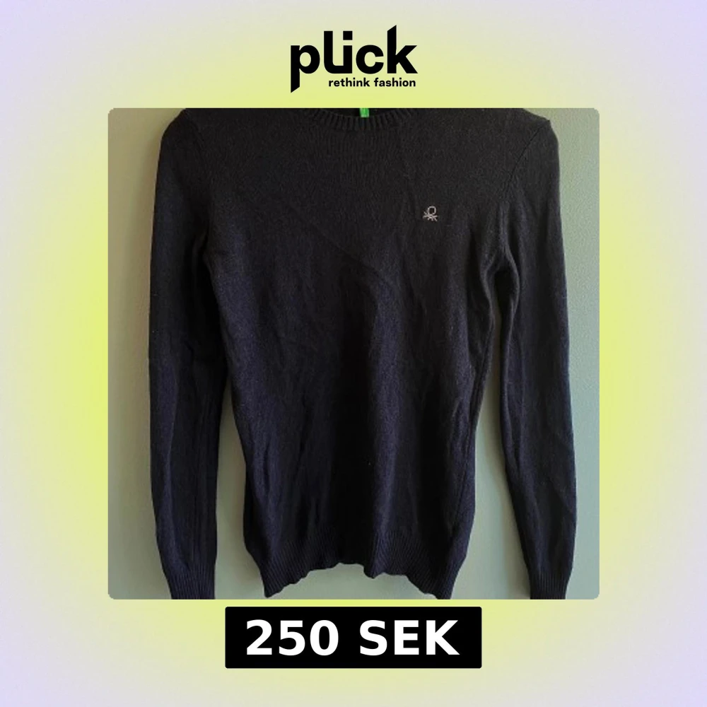 Säljer en stilren svart tröja från United Colors of Benetton. Tröjan är tillverkad i en mjuk blandning av ull, polyamid, viskos och kashmir. Den har långa ärmar och en klassisk rund halsringning.