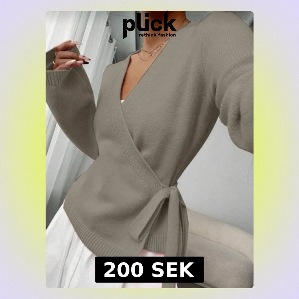 Trendig beige omlottkofta med knytband i midjan och ribbade muddar. Koftan har en djup v-ringning och långa ärmar, perfekt för lager på lager. Mjuk och skön stickad kvalitet som ger en avslappnad men snygg look.