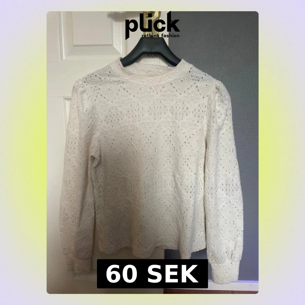 Säljer en vit långärmad tröja från Holly & Whyte by Lindex i storlek XS. Tröjan har ett vackert spetsmönster och rund halsringning.