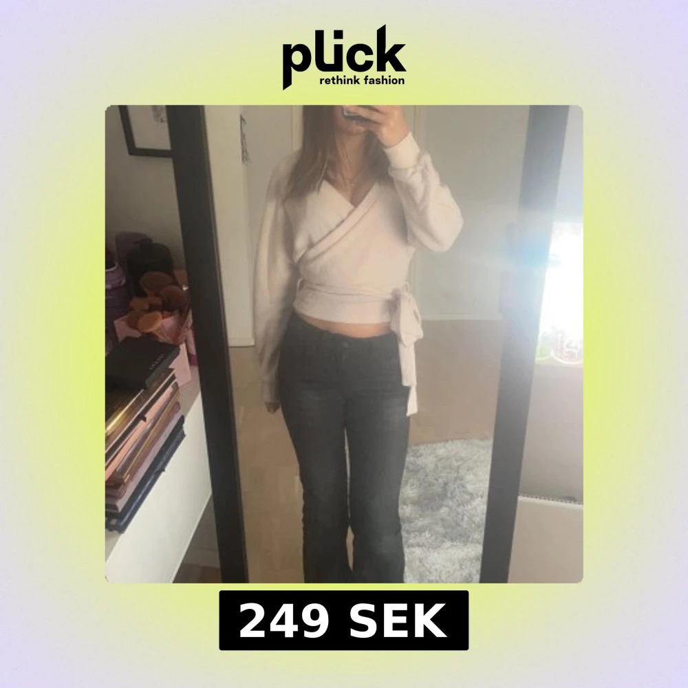 Supersnygg ljusbeige omlott-tröja med knyt i midjan och v-ringad hals. Tröjan är croppad och har långa ärmar med ribbade muddar. Perfekt att styla med jeans eller kjol för en trendig look.