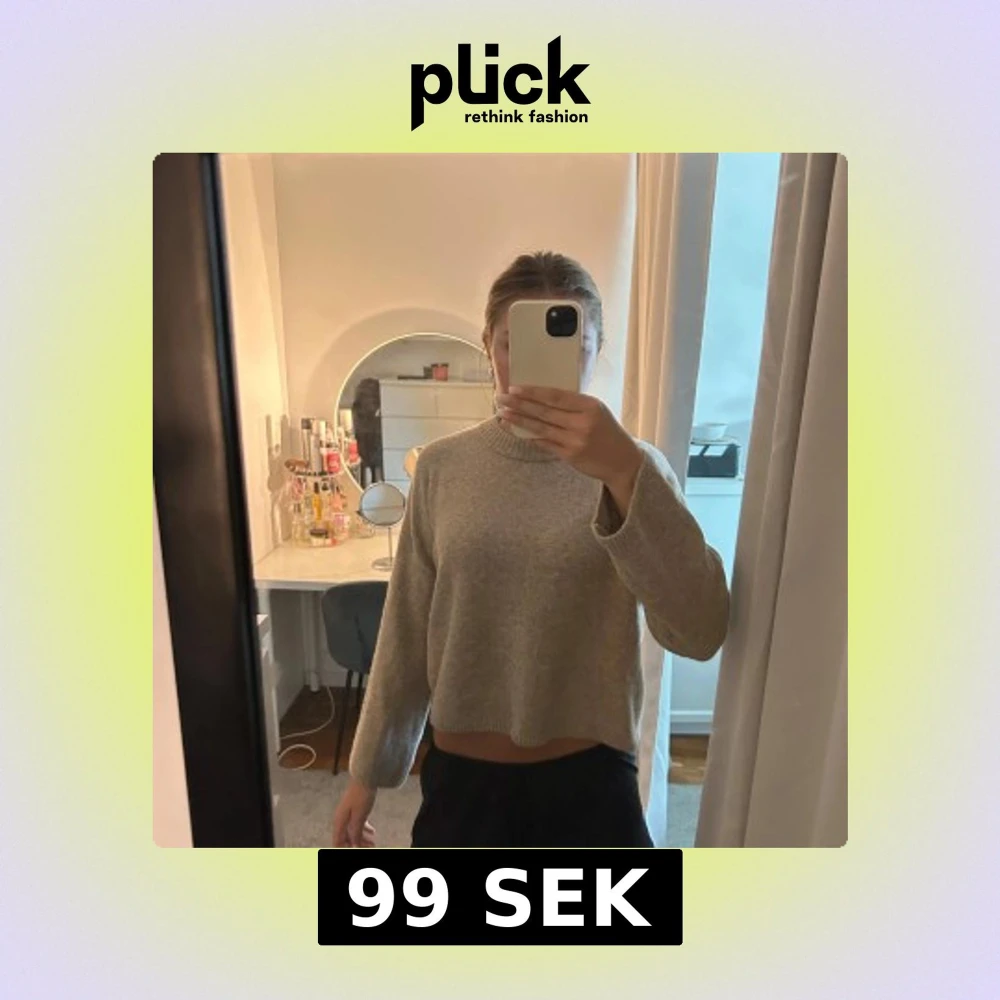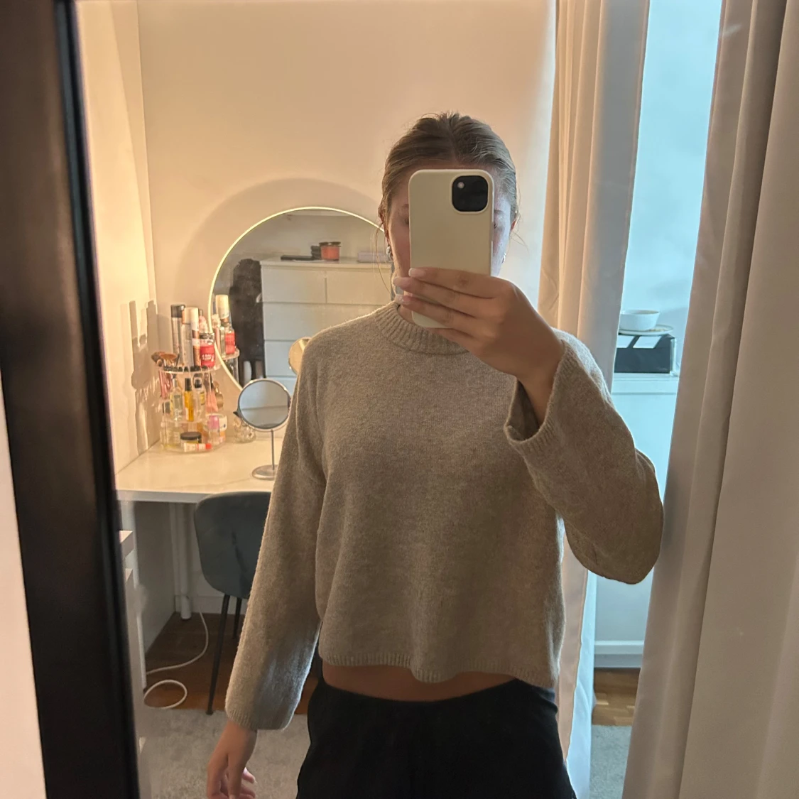 Mysig beige stickad tröja med rund hals och långa ärmar. Modellen är croppad och har en loose passform som ger en avslappnad vibe. Perfekt att slänga på sig när det är kyligt ute.