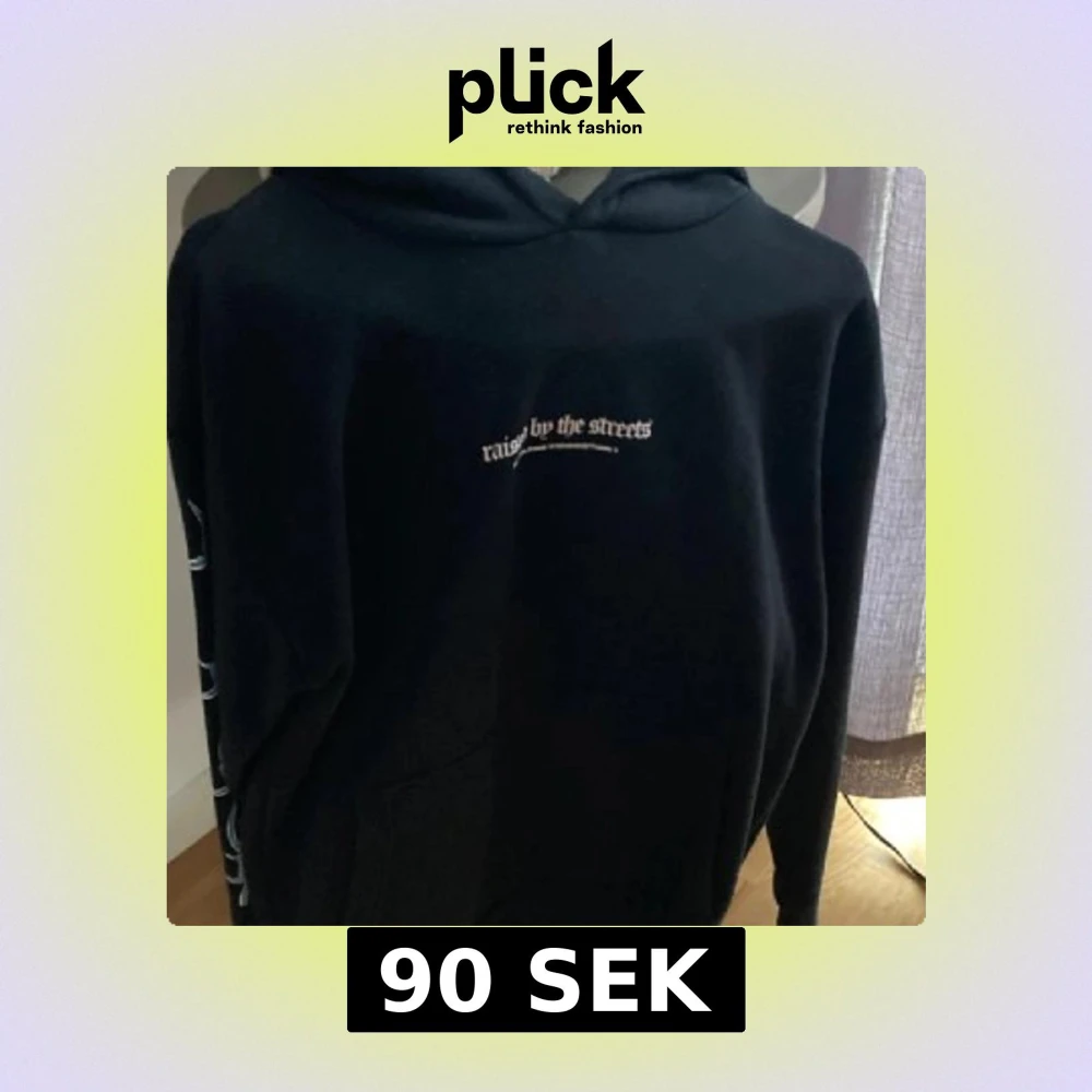 Svart hoodie från Raised by the Streets med tryck på både bröstet och ryggen. Stora grafiska bokstäver och taggtrådsmotiv på ryggen, samt mindre text framtill. Klassisk huva och känguruficka. Aldrig använd. Stor i storleken Snarare S än XS