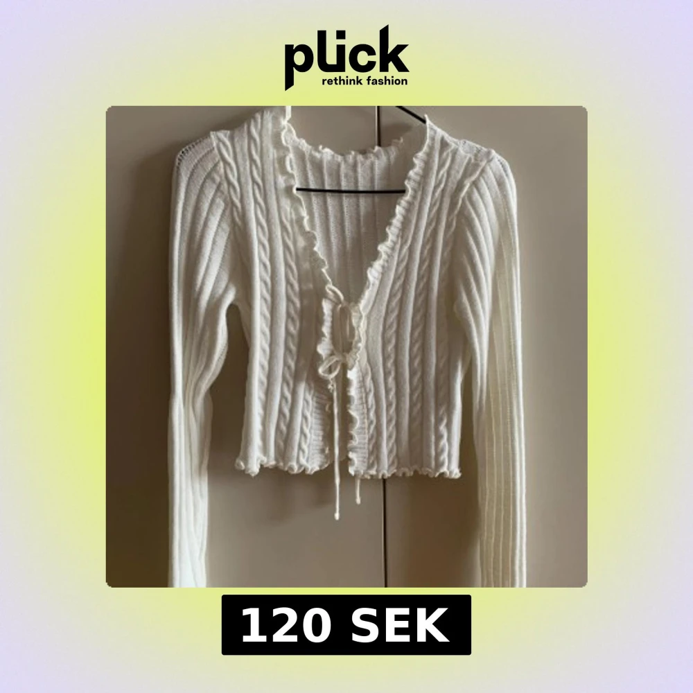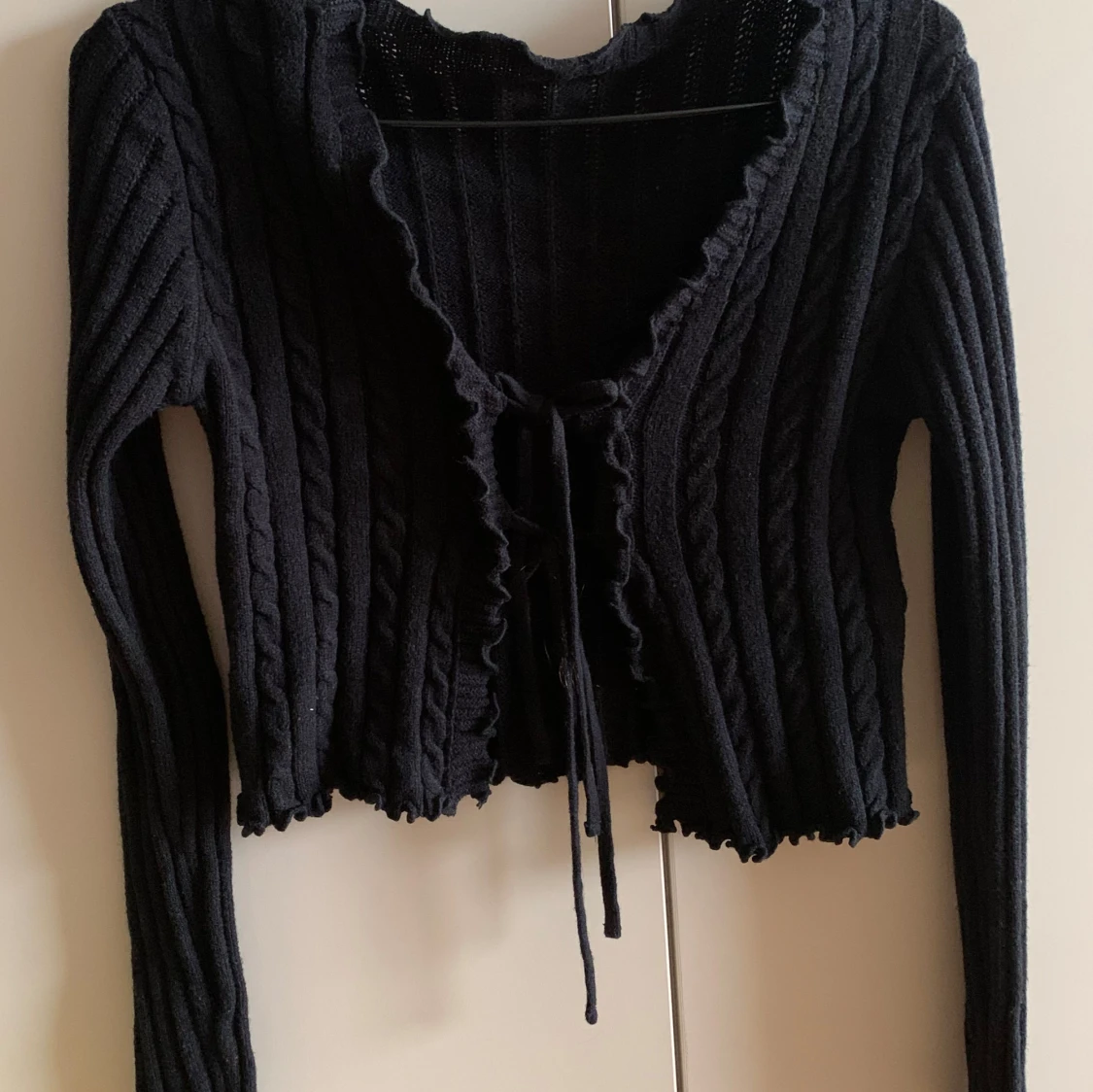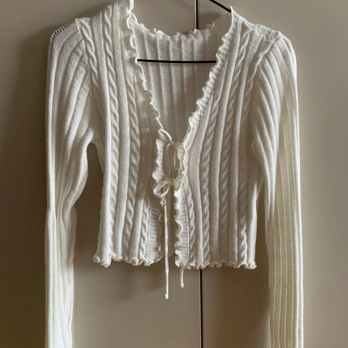 Säljer två ribbade koftor i vitt och svart. Båda har långa ärmar och en v-ringad design med knytning framtill. De är croppade med volangdetaljer längs kanterna. Perfekta för lager-på-lager-stil! 120kr för båda!