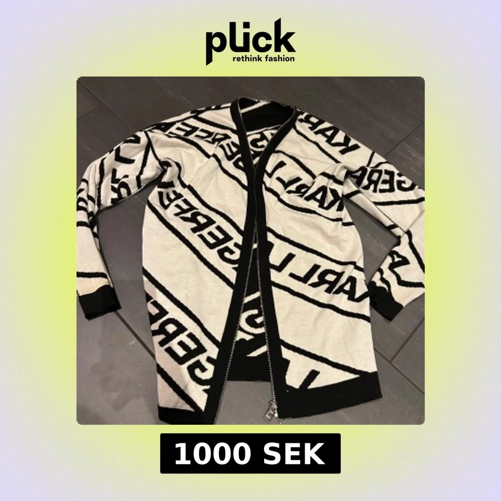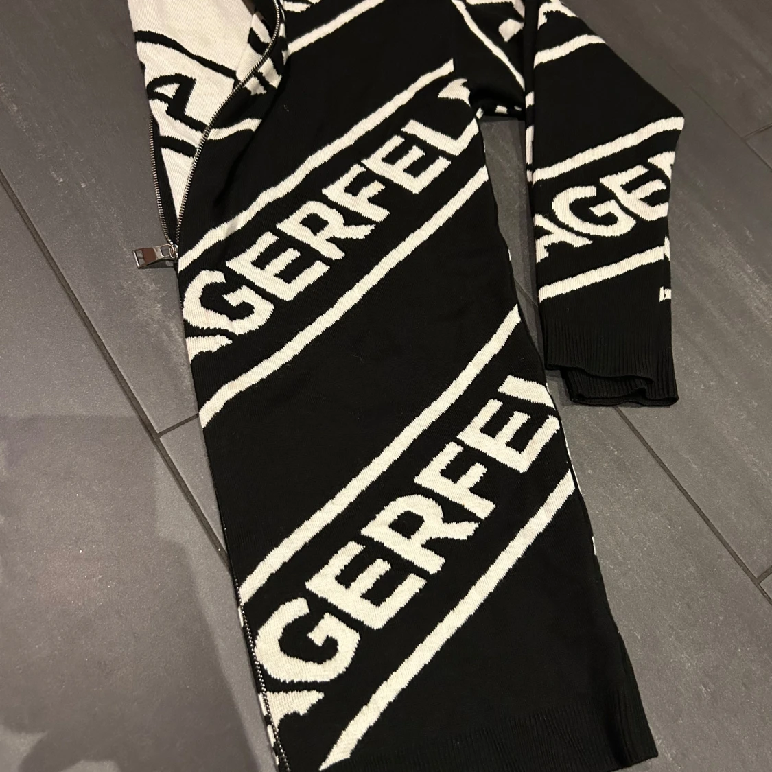 Snygg svartvit kofta från Karl Lagerfeld med ett iögonfallande mönster av märkesnamnet. Koftan har en dragkedja framtill och långa ärmar. Perfekt för att ge din outfit en stilren touch.
