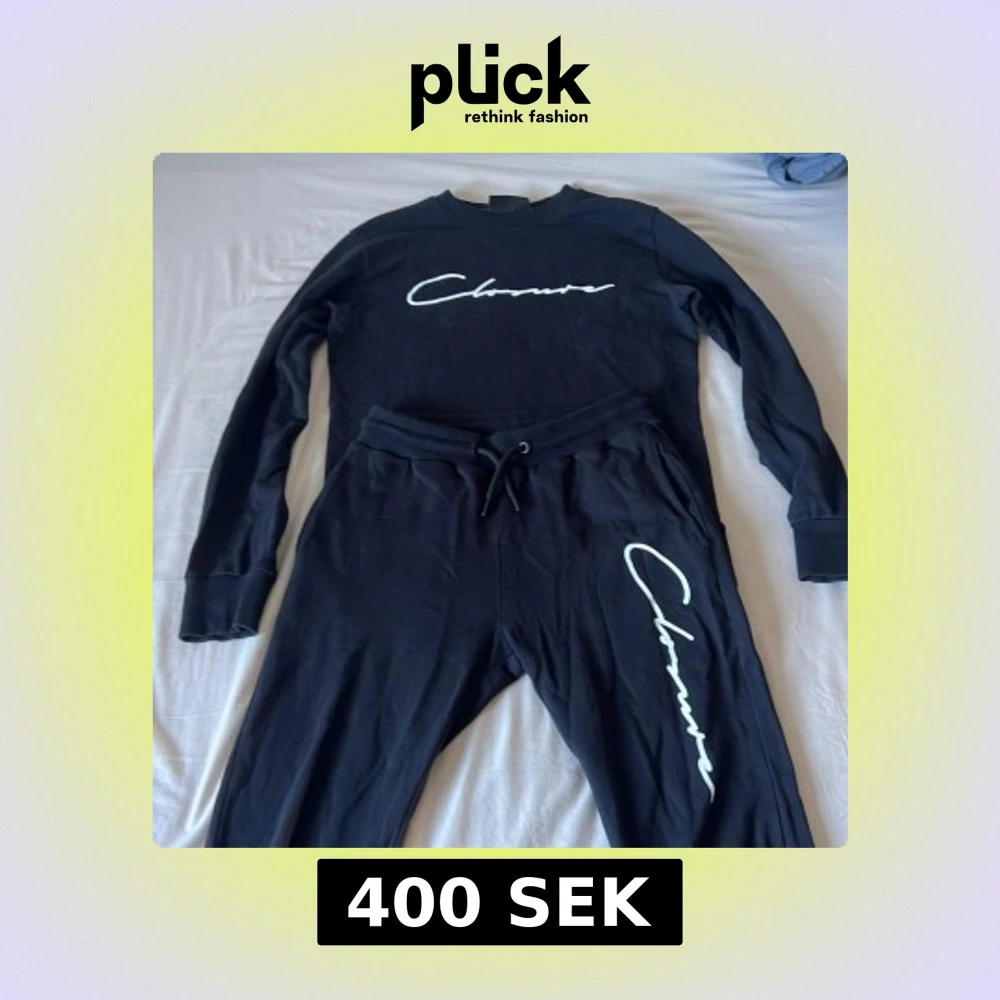 En Svart tracksuit byxa/långärmad tröja från Closure London med vit logotyp tryckt över bröstet. Tröjan har rund hals och ribbade muddar vid ärmslut och nederkant. Materialet är mjuk bomull som känns skönt mot huden, perfekt för chill dagar. Snygg och enkel stil med normal passform.