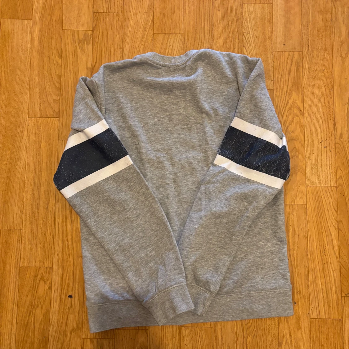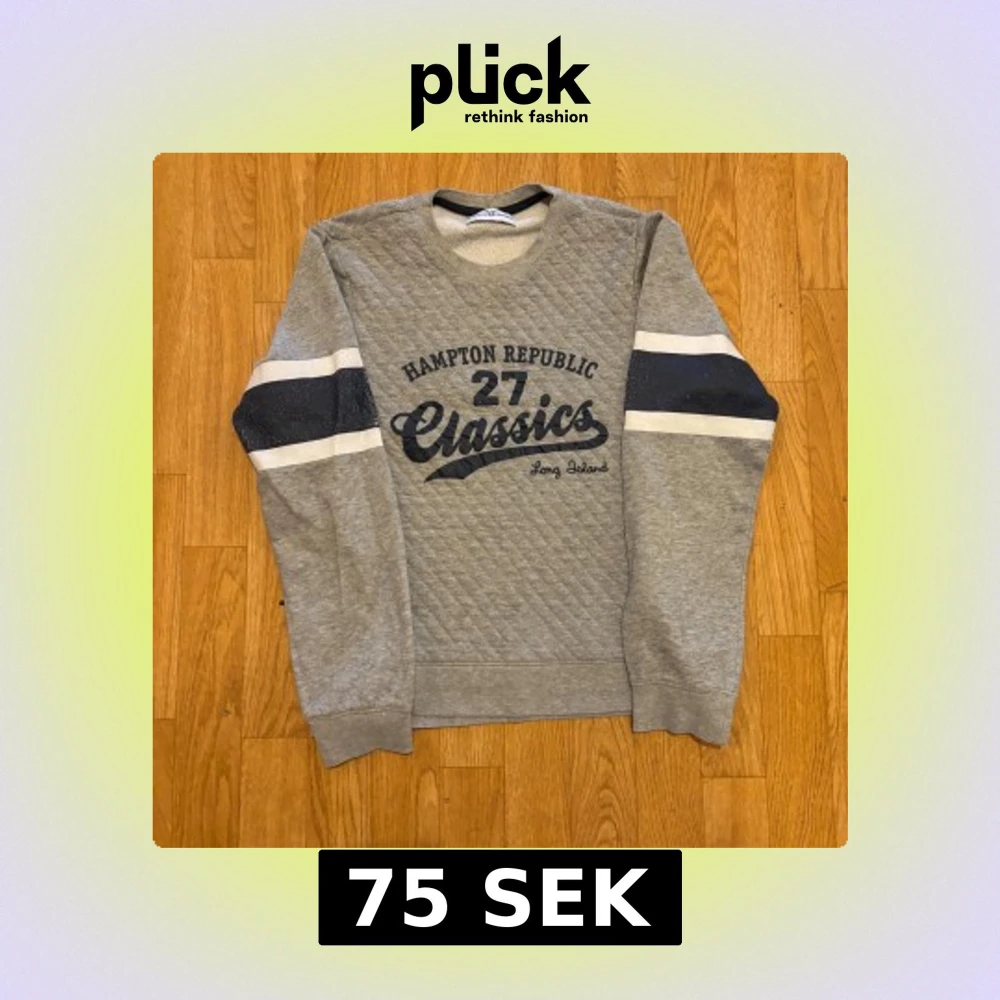 Grå quiltad sweatshirt från Hampton Republic med tryck på bröstet och mörkblå samt vita ränder på ärmarna. Klassisk crewneck-modell med lång ärm och mjukt material, perfekt för en avslappnad stil.
