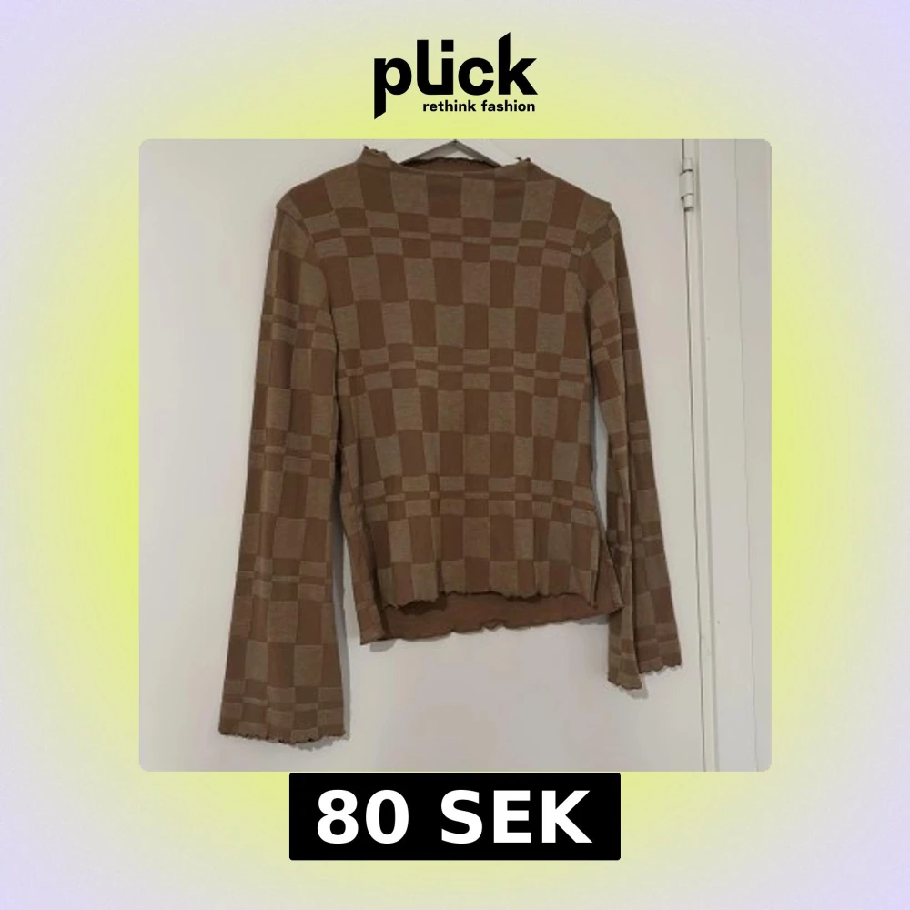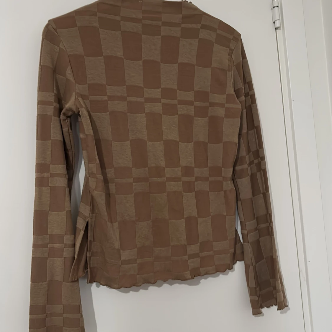 Säljer en brun långärmad topp med rutigt mönster i två nyanser av brunt. Toppen har en lätt croppad passform med vågig kant vid ärmslut och nederkant. Perfekt för dig som gillar retrovibbar och unika detaljer.