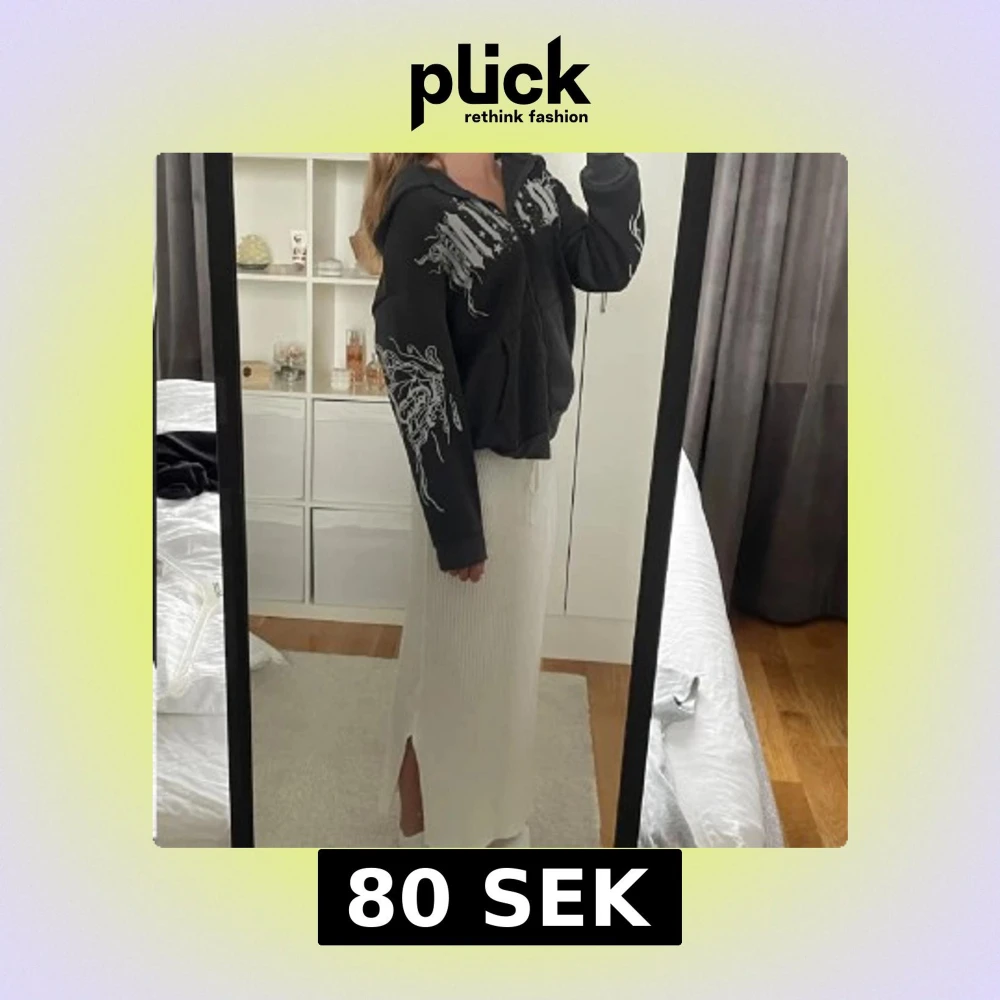 Säljer en svart hoodie med coolt vitt tryck på bröstet och ärmarna. Hoodien har dragkedja och en bekväm passform med långa ärmar och en stor huva. Perfekt för en avslappnad stil.
